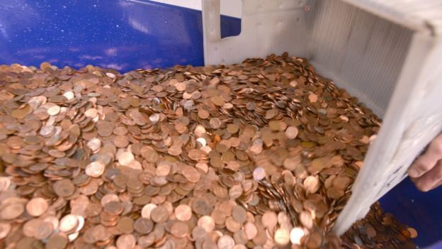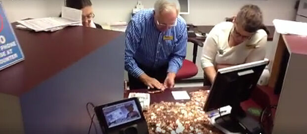 De primeras empezaron a contar usando una máquina automática para contar monedas pero se atascaron así que están contando a mano, y llevan desde entonces así. Ahora mismo son las 6:08 pm y todos los empleados de DMV se están quedando hasta tarde para terminar de contar. El encargado cree que al ritmo que están contando les llevará hasta la 1:00 AM o más terminar de contar los 298.745 peniques a mano.