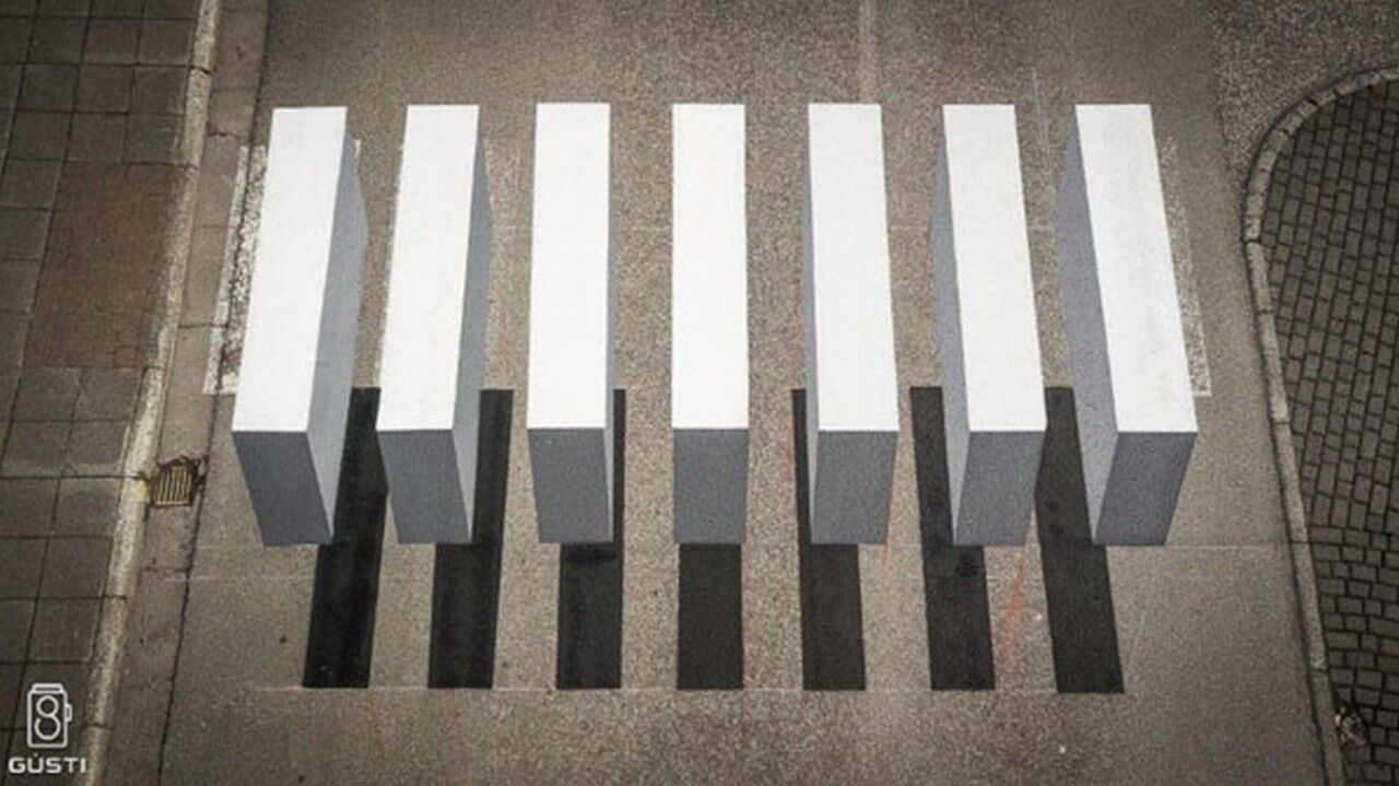 El efecto óptico que provoca el visualizar el paso de cebra en tres dimensiones desde cierta distancia, provoca que los conductores reduzcan la velocidad pausadamente ante la incredulidad de ver las barras flotando sobre el asfalto.