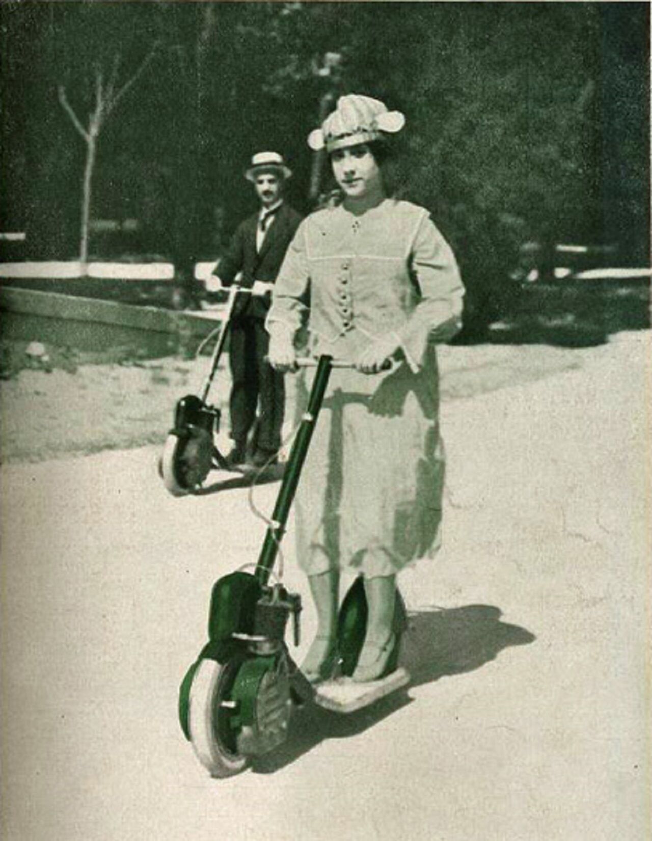 Nos creemos muy avanzados con nuestras maletas motorizadas, nuestras bicis inteligentes y nuestros drones, pero no tenemos ningún mérito. En 1916 ya llamaban al uso de los patinetes motorizados en nombre del progreso y la efectividad. Y ahora, un siglo más tarde, una de estas pequeñas joyas será subastada.