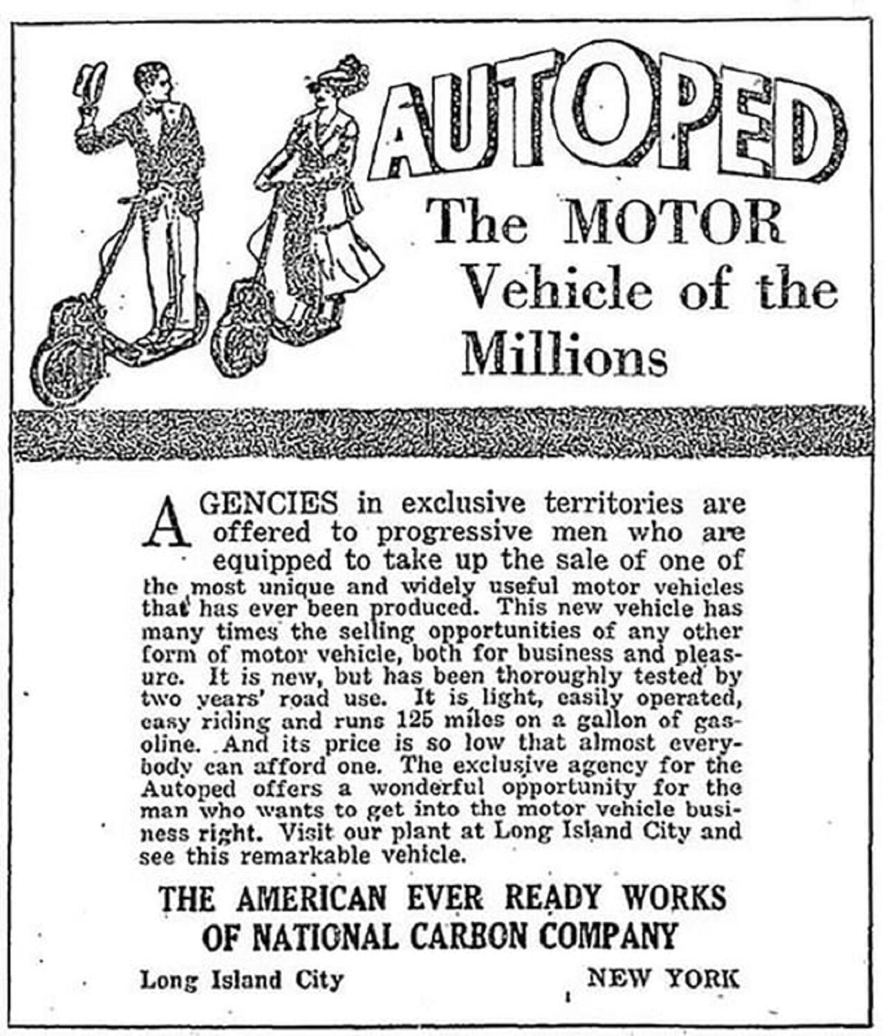 El primer scooter de la historia fue bautizado como Autoped y fue manufacturada en Nueva York desde 1915 hasta 1921. Se vendía por 100 dólares. Con un motor de 162 cc, alcanzaba los nada desdeñables 40 km/h, consumía 1,9 l/100 km, y además se podía doblar y contaba con luz frontal.