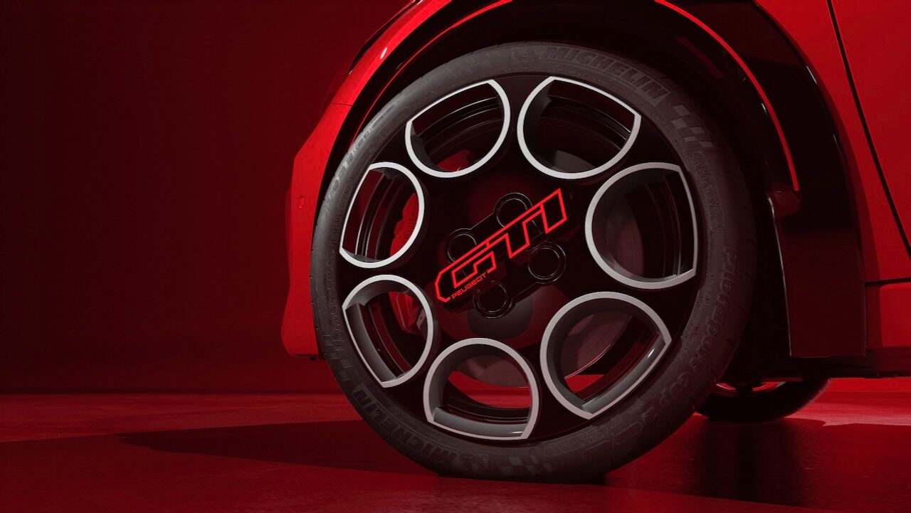 Tomando como base el Peugeot 208 en formato eléctrico, se ha hecho un trabajo ejemplar para mejorar prácticamente todos sus aspectos. El diseño exterior es bien reconocible por unas vías ampliadas y detalles en rojo, además de paragolpes más prominentes y aerodinámicos. Tanto es así, que el E-208 GTi ha bajado 30 mm la altura de su carrocería y aumentado sus vías delanteras 56 mm. Uno de los detalles más llamativos son las llantas de 18 pulgadas con diseño inspirado en las del 205 GTi, además de las siglas en el buje central. La firma luminosa es específica, al igual que el habitáculo.