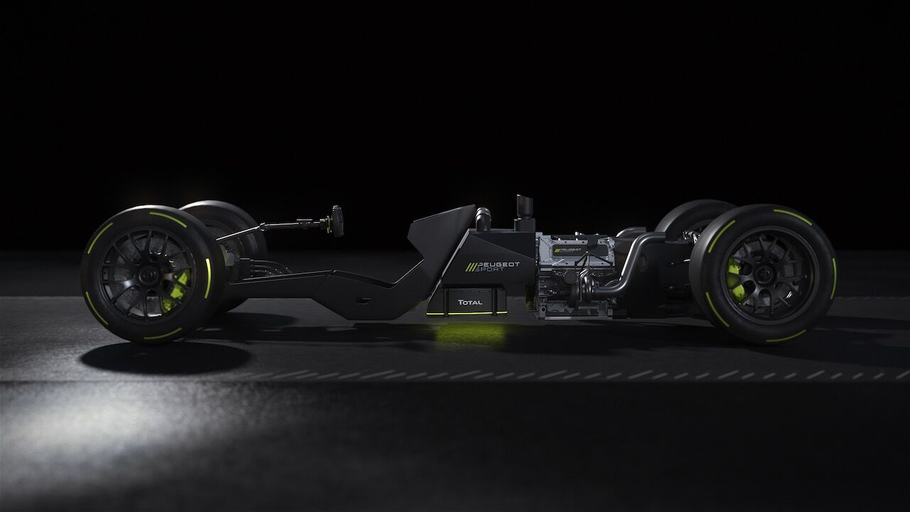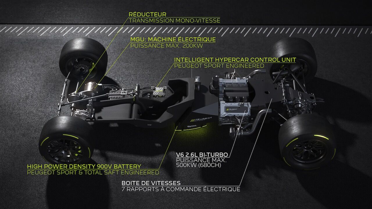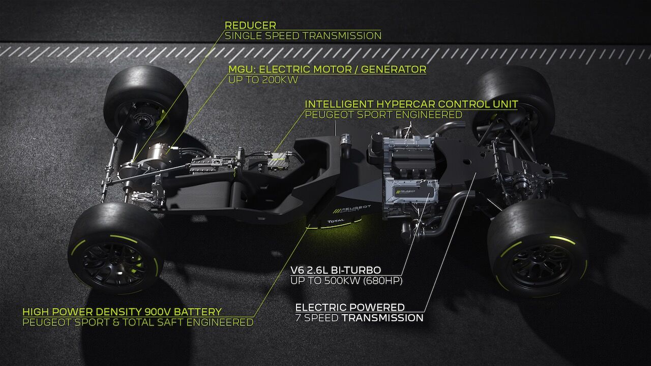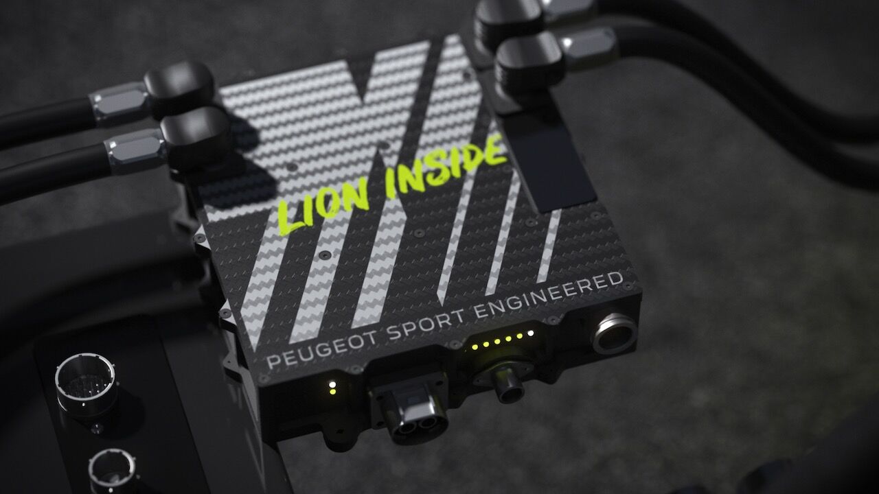 Por temas de homologación, Peugeot tendrá que sumar estar mecánica a un ejemplar de producción y esa siempre es una buena noticia. Más si tenemos en cuenta de que se basa en un motor de gasolina V6 biturbo de 2.6 litros colocado en posición central y sumado a una mecánica eléctrica en el eje delantero. El de gasolina entrega por sí solo 680 CV de potencia, pesa apenas 165 kg y sirve para mover exclusivamente el eje trasero. Se emplea una transmisión secuencial de siete velocidades con levas en el volante.