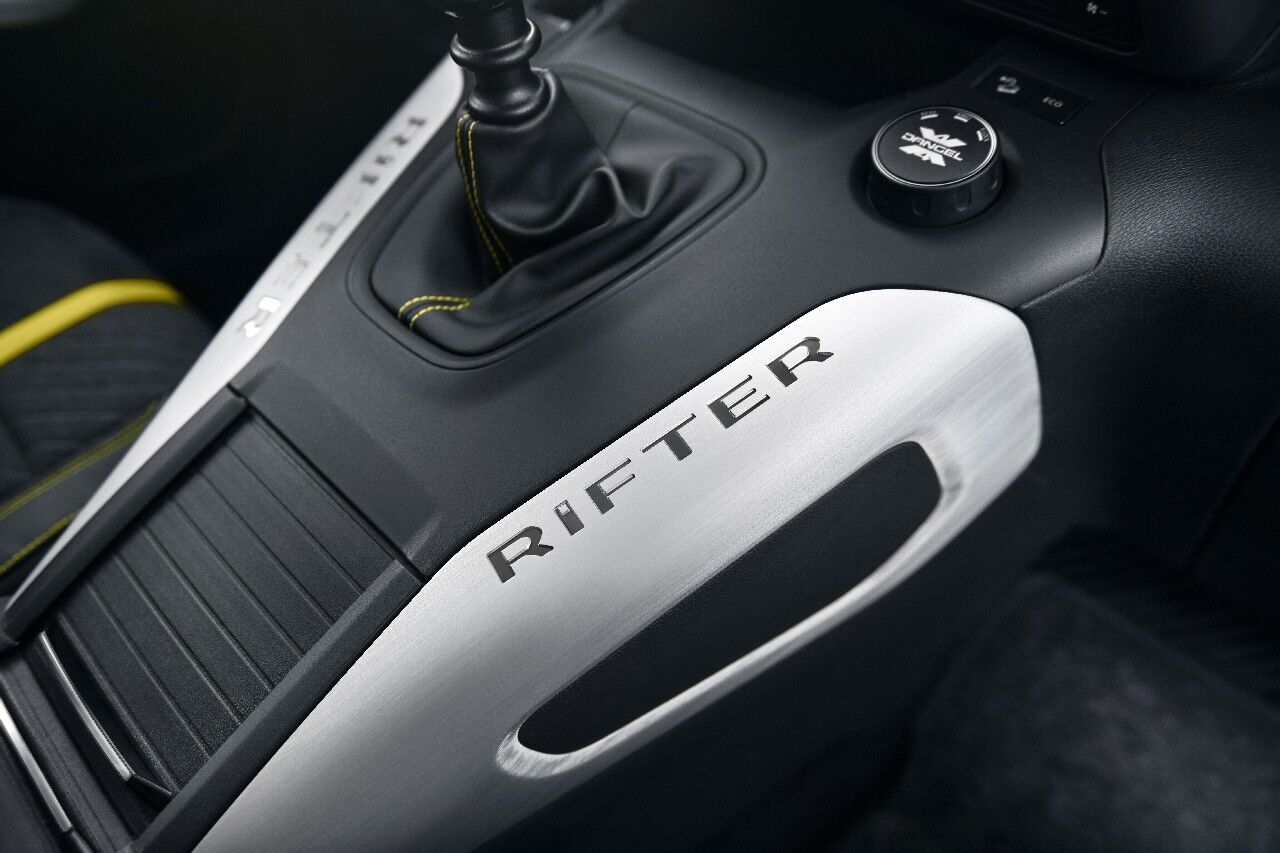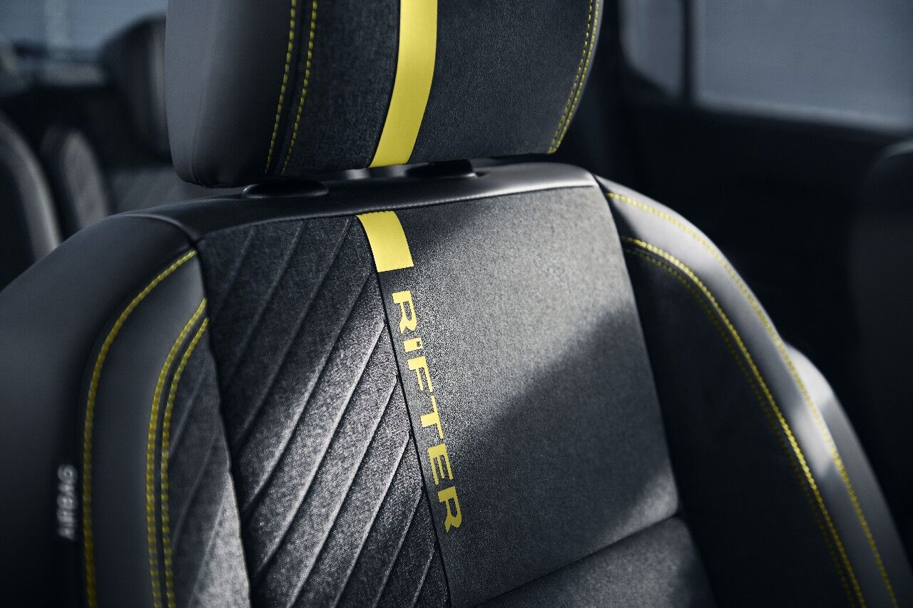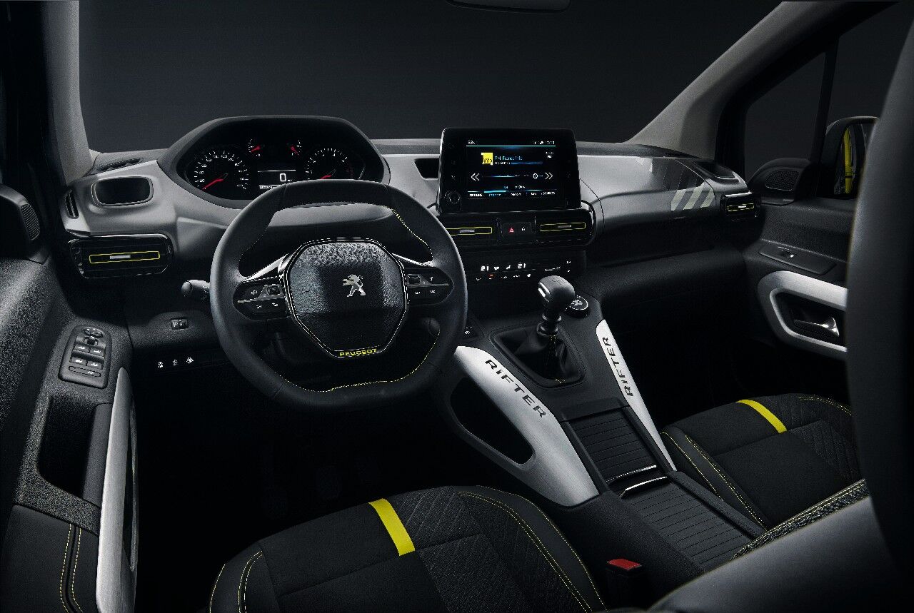 El juego de colores que se podía ver en el exterior se repite en el interior del Peugeot Rifter 4×4 Concept. Tela gris, Alcántara negro y pespuntes amarillos en neopreno se suceden en el habitáculo. Las molduras de aluminio macizo también son exclusivas del prototipo y cuentan con el nombre del modelo.