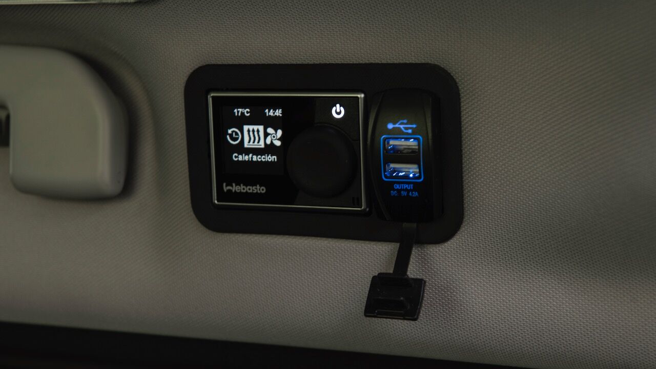 Entre su equipamiento cuenta con una batería auxiliar AGM de 80 aH que se recarga con el funcionamiento del propio vehículo y con una centralita de baterías que proporciona el voltaje de la batería principal del vehículo y la auxiliar. También se puede cambiar la luminosidad del interior con los dos flexos y una luz LED de doble intensidad. Se suman varias tomas de 12 V y USB repartidas por el habitáculo.