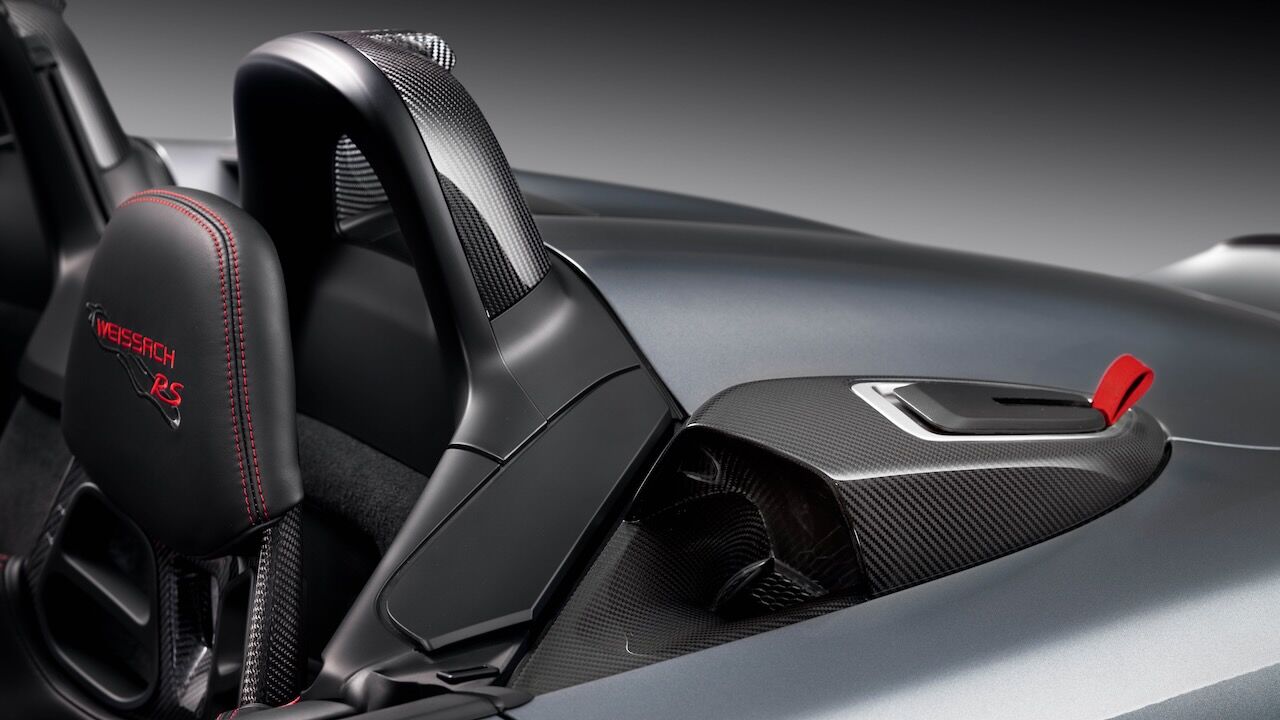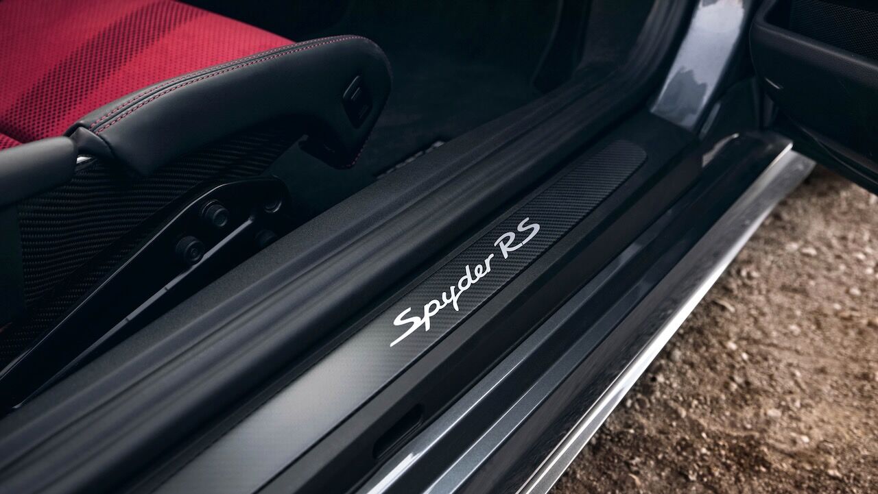 Como se puede apreciar, es bastante más rápido que el Porsche 718 Spyder «no RS». Pero no sólo eso, también es 40 kg más ligero que su versión con el cambio PDK y 5 kg más ligero que el 718 Cayman GT4 RS en formato coupé. Para llegar a sus apenas 1.410 kg, se ha hecho un uso intensivo de materiales ligeros. El techo pesa solo 18,3 kg y es totalmente extraíble, incluso se podría dejar la capota en casa para ahorrar otros 8 kg. Tiene un capó de polímero reforzado con fibra de carbono (CFRP) y mejora su aerodinámica con detalles como las tomas de aire NACA, los deflectores laterales, el splitter delantero o el spoiler con forma de cola de pato.