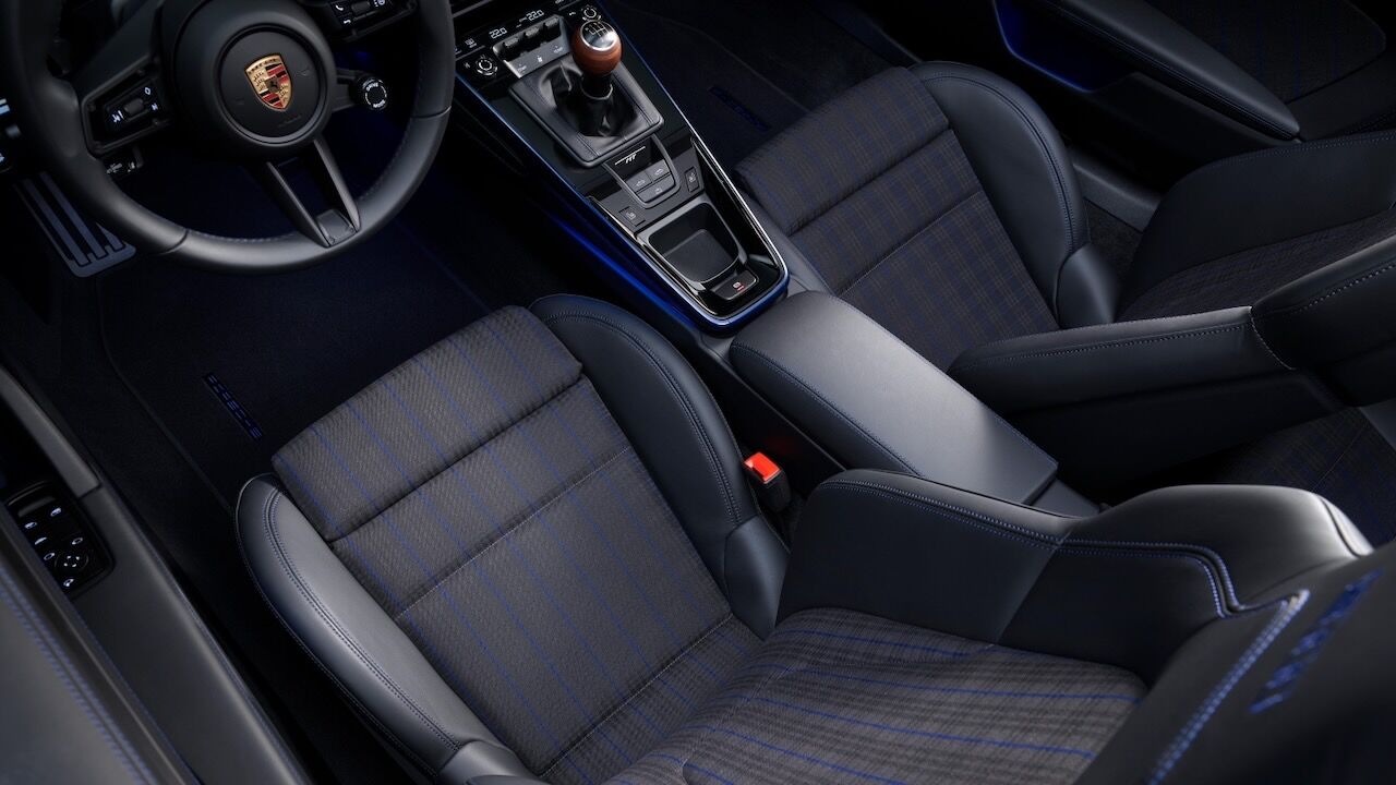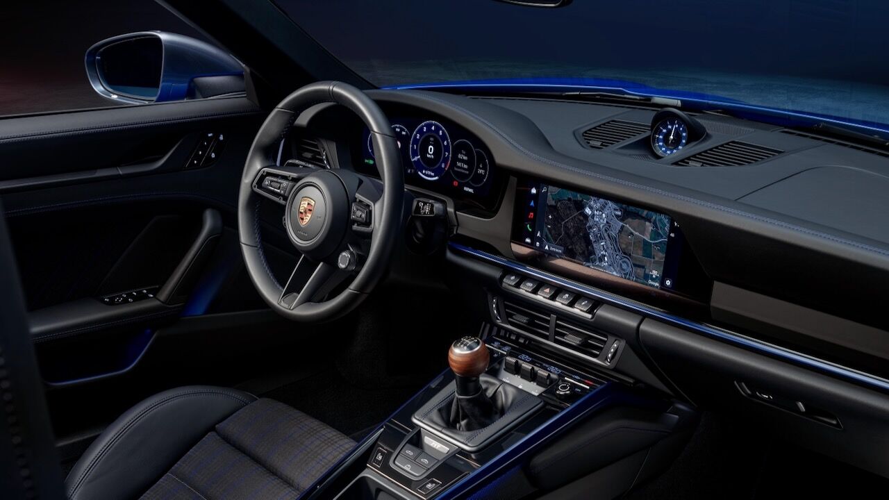 En el habitáculo del Carrera T destaca la tapicería en negro, pero sobre todo la la palanca de cambios. Se trata de un pomo de madera laminada de nogal de poro abierto con un tacto de calidad y recorridos cortos que hará las delicias de cualquier purista. No faltan detalles como el volante deportivo GT tapizado en cuero y calefactado (opcional de Race-Tex) y hay una interesante lista de equipamiento opcional disponible para el clientes.