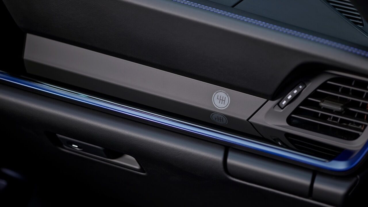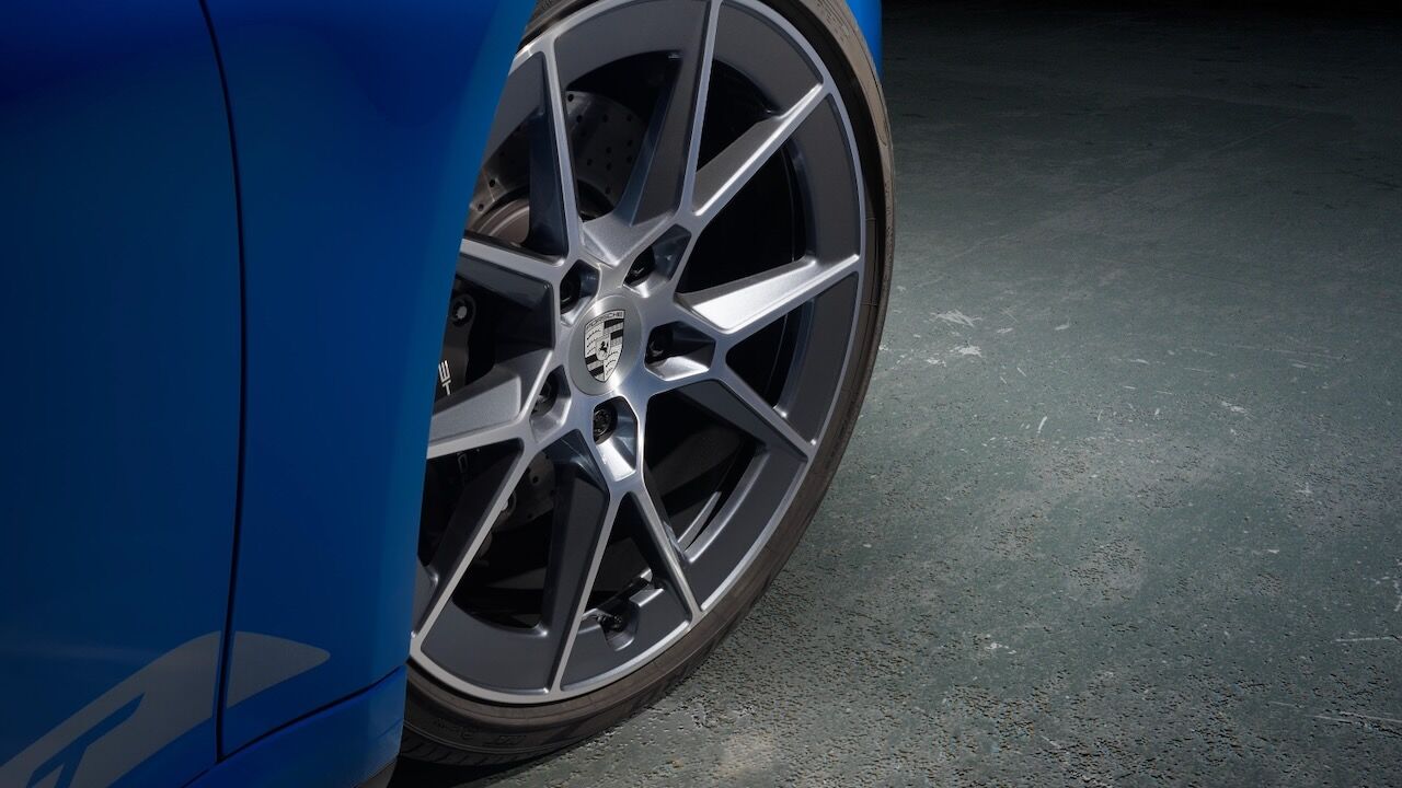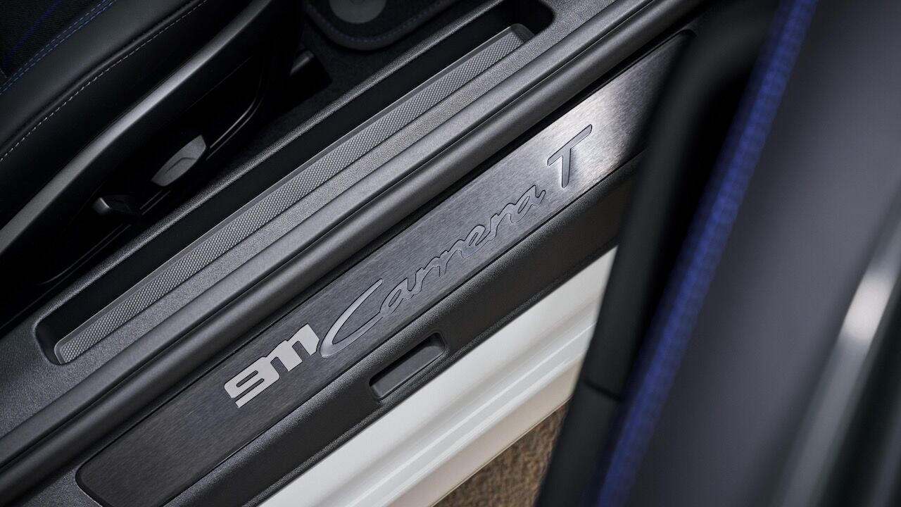 Para diferenciar el Porsche 911 Carrera T del resto de versiones hay que fijarse en algunos detalles. Los adhesivos con el esquema de marchas en las ventanillas traseras o el nombre de la versión en gris lo delatan en el exterior. Además, hay otros elementos como la rejilla trasera, los retrovisores o las llantas que también van en ese gris Vanadio metalizado a juego. Cuenta con el mismo alerón que el Carrera GTS y se puede elegir en infinidad de colores.