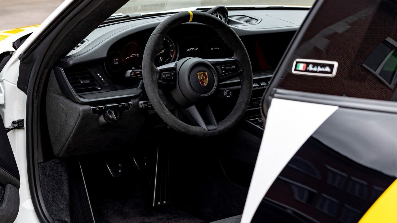 El trabajo comenzó con un 911 GT3 de penúltima generación (991.2), ya que el último modelo (992) se presentó solo en febrero de 2021. Acabado en Summer Yellow con detalles en blanco y negro, el biplaza de Zuffenhausen luce con orgullo el número 7 en ambas puertas como un guiño al éxito de su propietario a mediados de la década de 1980. El alerón trasero y la palanca de cambios son exclusivos de este modelo, al igual que la insignia en de Paolo en el pilar B y el trazado del circuito de Le Mans bordado en amarillo en los reposacabezas los asientos delanteros.
