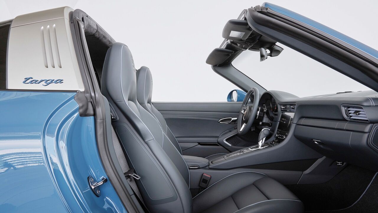 Al interior del Porche 911 Targa 4S Design Exclusive se accede mediante unos pasos de puera en acero inoxidable pintados en negro, con el nombre de la edición. En el habitáculo continúa el juego de colores exterior, con asientos deportivos adaptables Plus y ajuste de 18 vías, con costuras en contraste y reposacabezas con el logotipo de Porsche bordado.