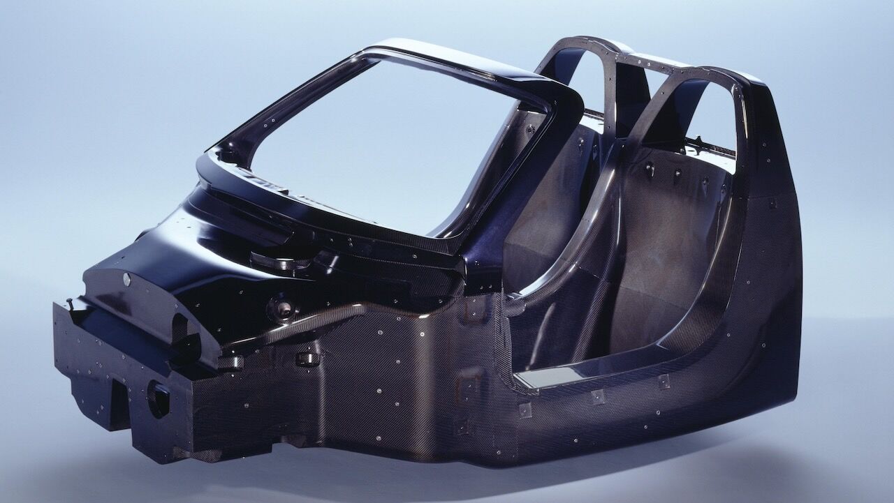 El chasis monocasco y el subchasis también eran de carbono, algo revolucionario en su época, lo que permitía un peso contenido de apenas 1.380 kg. Además, se incorporaban soluciones aerodinámicas avanzadas, como el alerón trasero retráctil que se desplegaba automáticamente a partir de los 120 km/h para mejorar la estabilidad.