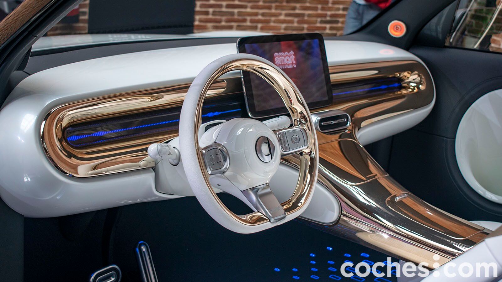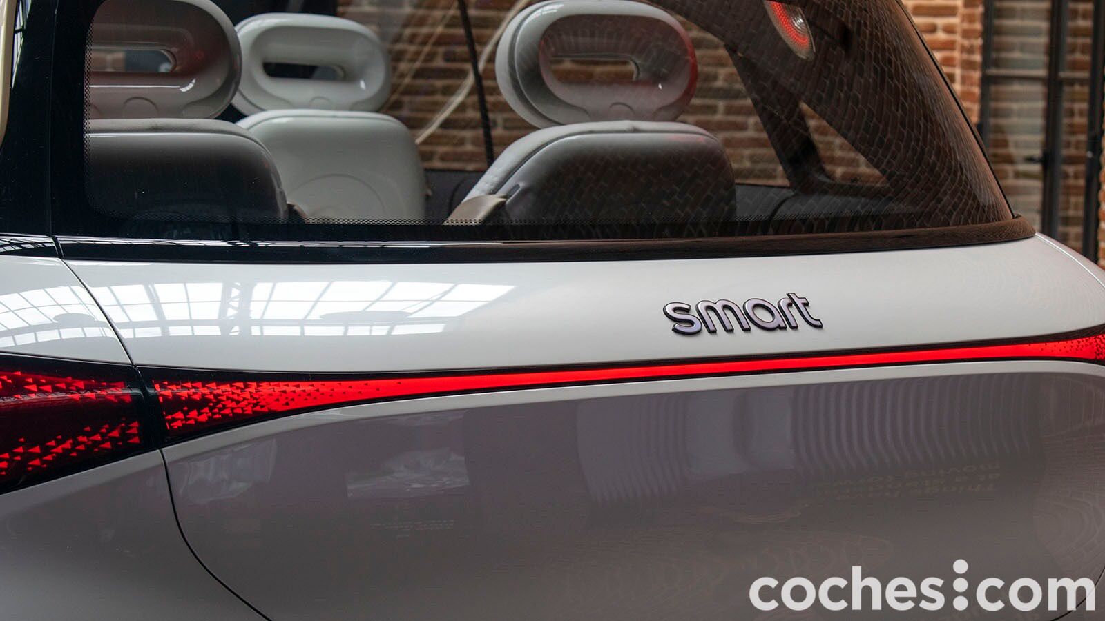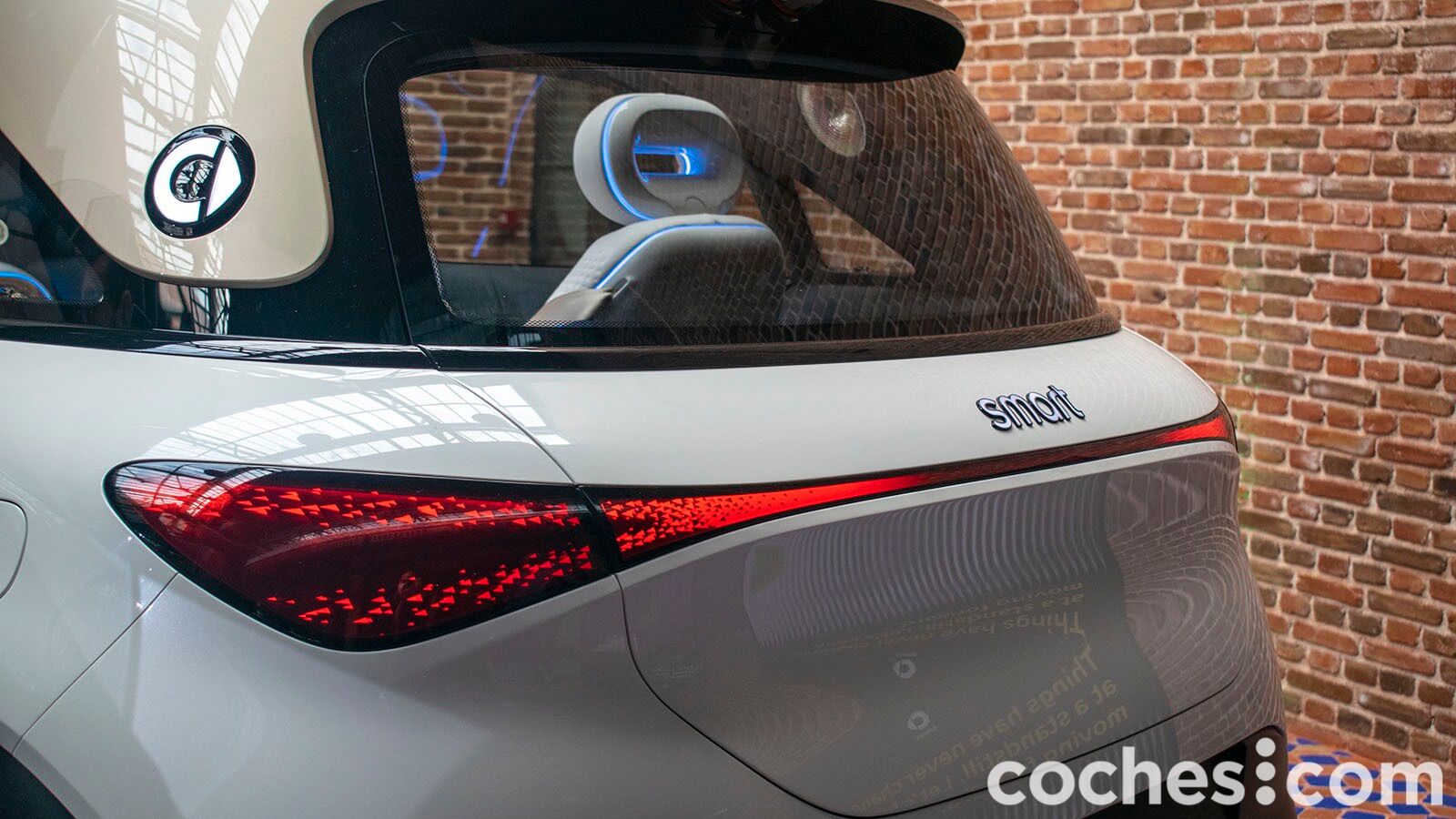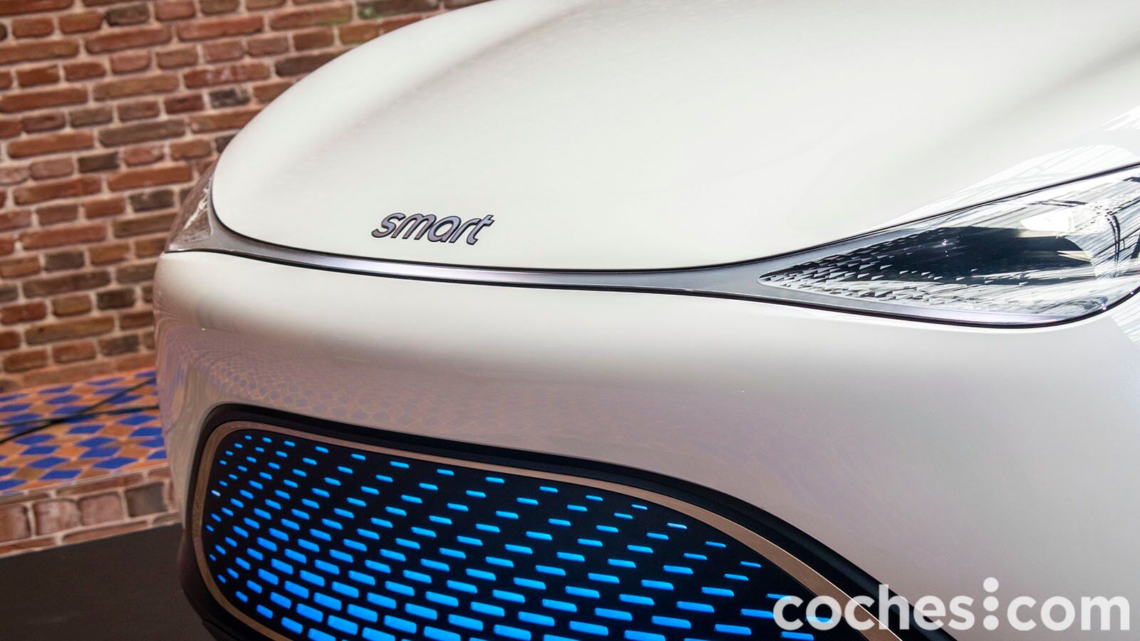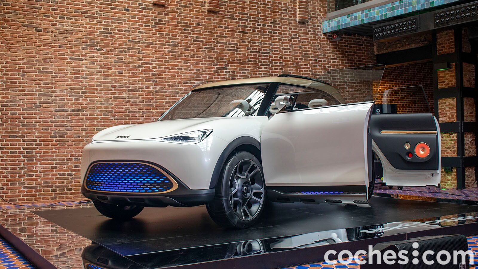 Lo que queda claro es que el smart Concept #1 no pasa desapercibido. Las formas son muy fluidas en el frontal y toda la atención se centra en la iluminación. Además de los faros delanteros unidos por el centro, también cuenta con una parrilla inferior iluminada en varios colores y en la que se pueden dibujar gráficos (como una cuenta atrás). Las llantas de gran tamaño denotan que estamos ante un prototipo, al igual que los tiradores enrasados en la carrocería. Bueno, en realidad no hay tirador al uso, el coche se abre acercando el móvil.