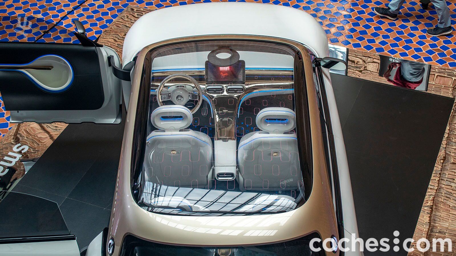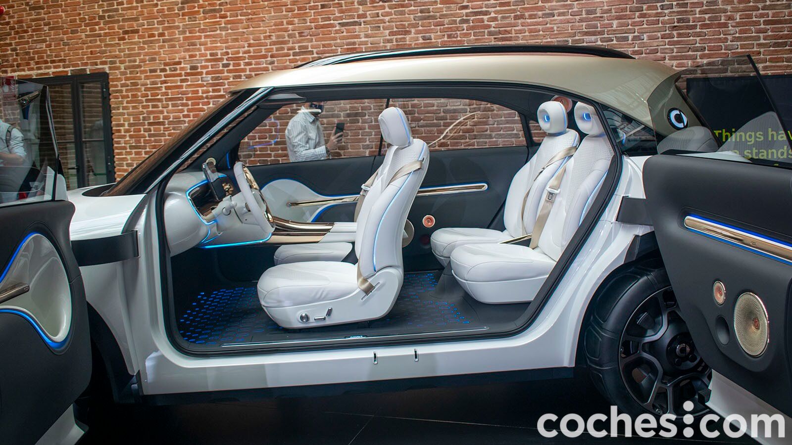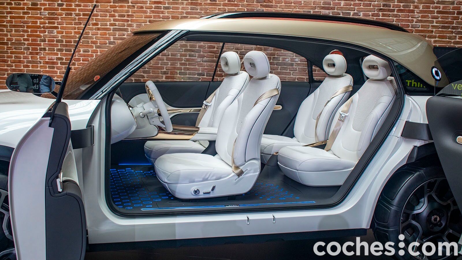 Como decíamos, la ausencia de pilar B da un cómodo acceso al habitáculo. El smart Concept #1 es el modelo más grande hasta la fecha y en la fase de prototipo cuenta con cuatro asientos individuales (en producción llegará con puertas normales y cinco plazas) y una gran habitabilidad. Un gran techo panorámico acentúa esa sensación y da mucha luminosidad. Además, se habla de que en la segunda fila el espacio para las piernas es similar al que tiene un Mercedes Clase E. El maletero no pudimos verlo, pero por sus proporciones parece que no será su punto más destacado.
