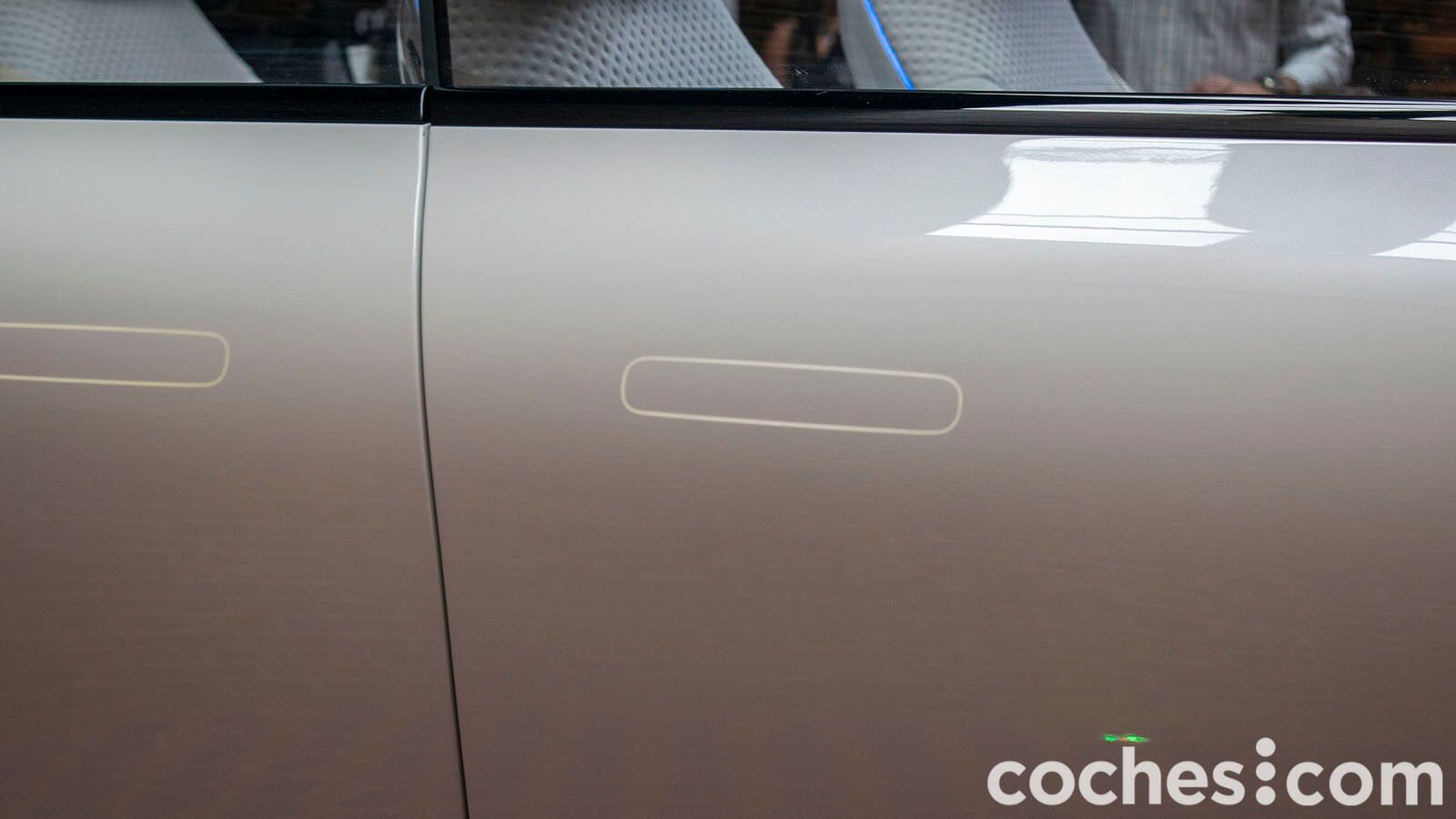 Después del frontal inspirado en un tiburón, vemos que desde el lateral se aprecia a la perfección un techo flotante en color dorado. Los pilares A van en negro, no hay pilares B y los C van integrados en el techo, con el logotipo de la marca bien presente. Eso hace que la zaga tenga un aspecto peculiar, con la parte superior más estrecha que la inferior. Aquí continúa el juego de luces con unos pilotos traseros unidos por el medio.