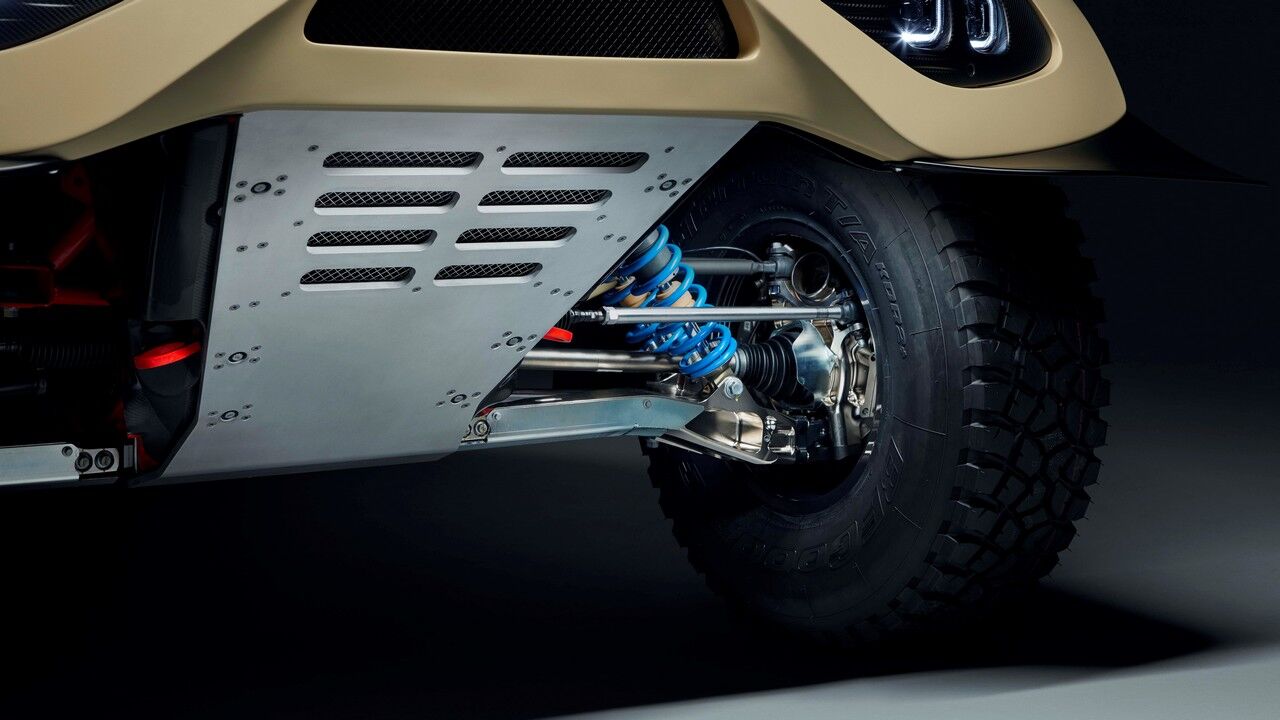 Construido alrededor de una estructura espacial de acero de alta resistencia y una suspensión de doble horquilla con amortiguadores dobles ajustables en cada esquina, el Prodrive Hunter ofrece 400 milímetros de recorrido de ruedas, un aumento de 50 mm con respecto al modelo de competición, que quedó en segundo lugar detrás el Toyota Hilux T1+ de Nasser Al-Attiyah a los mandos de Sebastian Loeb. Porque lo mejor del Hunter de calle es que conserva el motor, la caja de cambios y la configuración de la suspensión del modelo original.