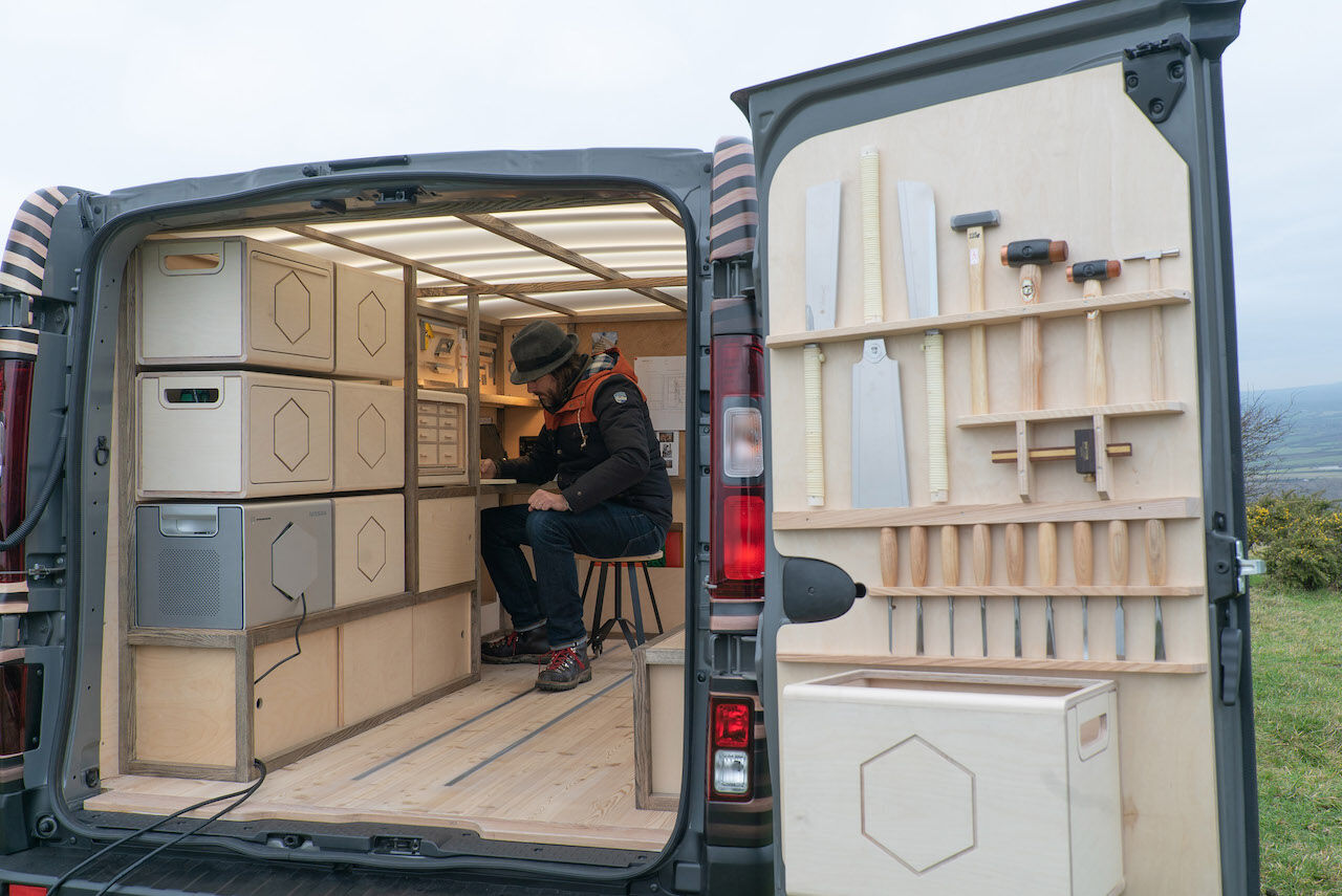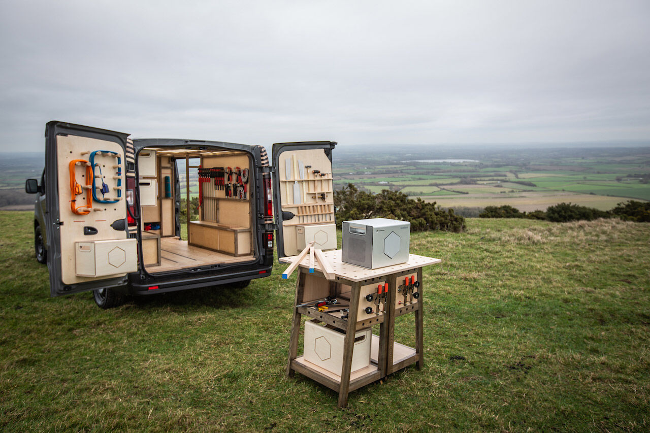 Este prototipo ha sido desarrollado con la ayuda de Studio Hardie, una empresa de diseño británica bien reputada. Con este ejemplar, el profesional de la carpintería podría tener una oficina móvil muy completa en la que poder llevar sus herramientas y todo tipo de material bien clasificado en distintos módulos. Incluso hay espacio para trabajar en el interior con una mesa y un taburete desplazable en un espacio que queda iluminado por LED situados en el techo.