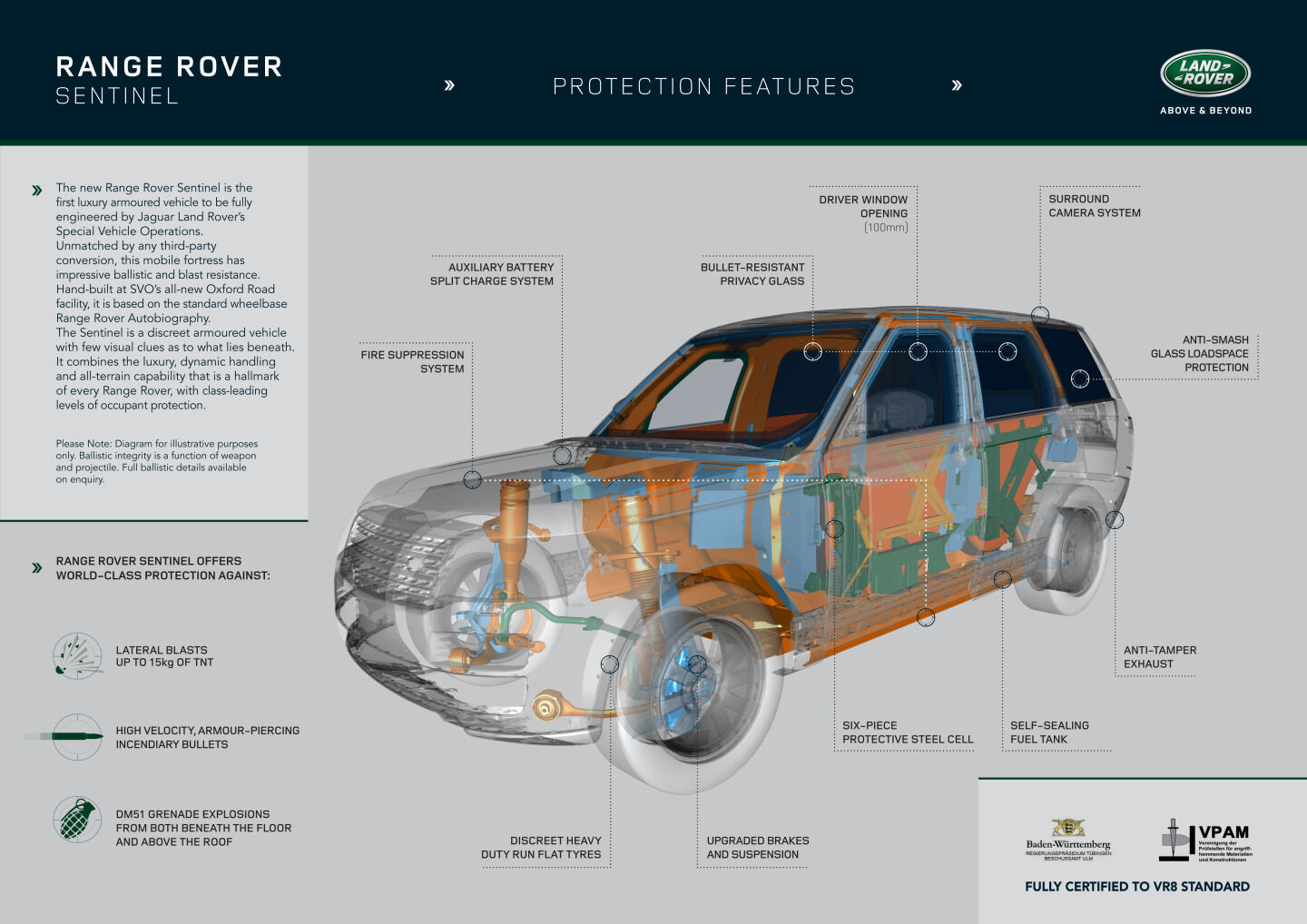 El resultado es una protección total ante casi cualquier tipo de ataque. El Range Rover Sentinel soporta ataques con balas antiblindaje de 7.62 mm., que explote una granada bajo el suelo o sobre el techo del vehículo y explosiones de dinamita laterales. Además, dispone de neumáticos antipinchazos que pueden rodar sin aire, un sistema de salida de emergencia trasera, sistemas de alarma personalizables, altavoces externos, extintor de incendios...