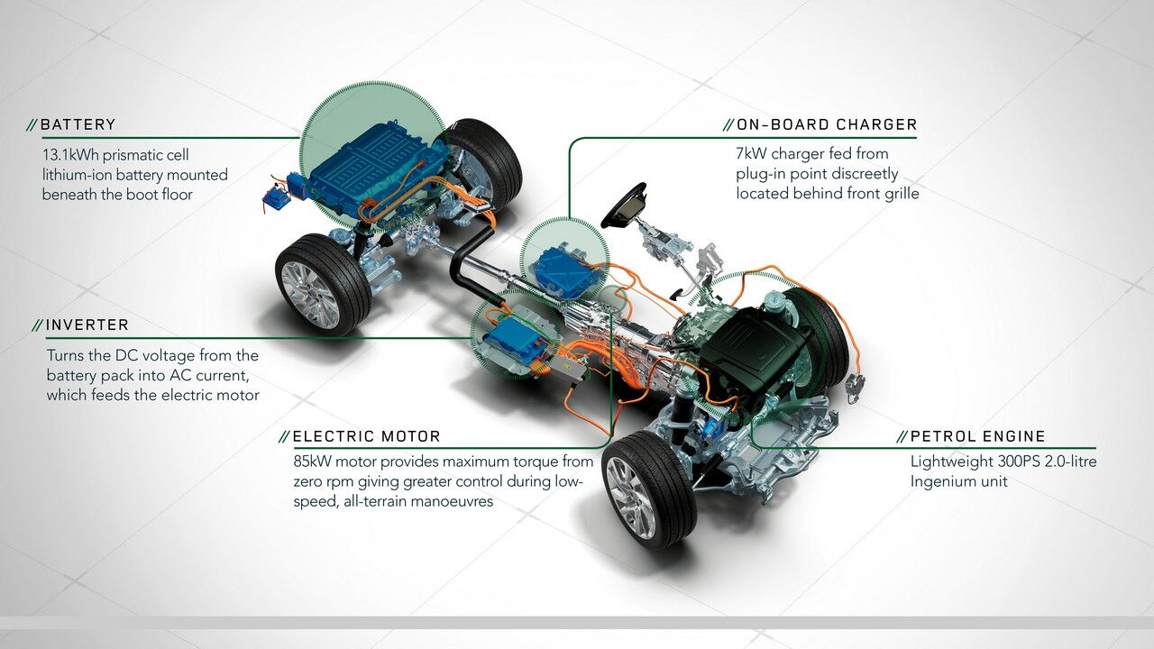 Aunque en esta versión la principal novedad es la mecánica híbrida enchufable. Está formada por el nuevo motor de gasolina Ingenium de cuatro cilindros y 2.0 litros (300 CV), al que se suma otro motor eléctrico (85 kW). Ambos se combinan para desarrollar una potencia de 404 CV y 640 Nm de par. Esta variante utiliza una transmisión automática ZF de ocho velocidades y la tracción total, como en otras versiones.