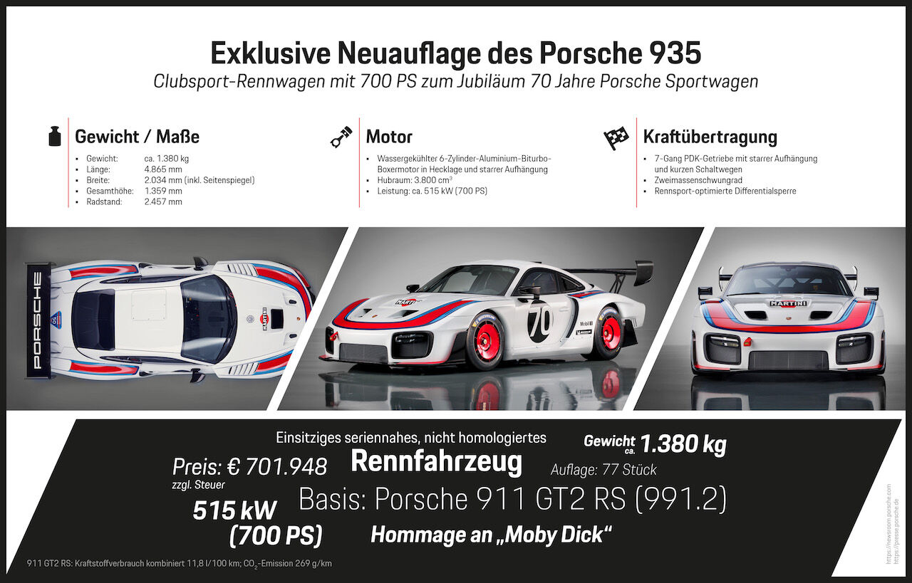 Lo que no ha cambiado respecto al modelo base es la mecánica. Sigue montando el seis cilindros bóxer biturbo de 3.8 litros que va ligado al cambio automático PDK y que entrega la potencia a las ruedas traseras. Son 700 CV de potencia para un modelo que apenas peso 1.380 kg, una relación realmente buena. De este Porsche 935 moderno solamente se harán 77 unidades, que comenzarán a repartirse en junio de 2019. Cada una tendrá un precio de 701.948 euros, impuestos no incluidos.
