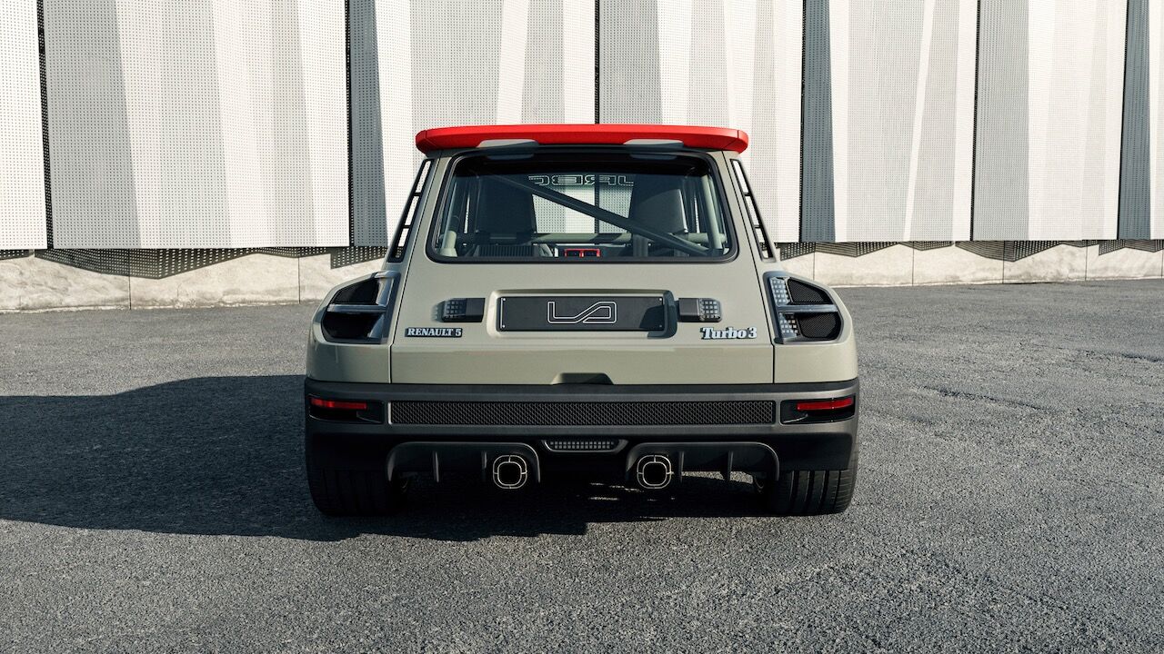 La primera premisa era que el Renault 5 Turbo 3 fuera reconocible de forma inmediata, aunque también que fuera posible detectar que es una versión especial y hecha a medida. Eso se puede percibir gracias a una carrocería de fibra de carbono con unas dimensiones que le hacen ser aún más deportivo. La zaga es probablemente la parte más bruta gracias a un alerón de techo de pequeñas dimensiones o al difusor trasero que integra dos salidas de escape circulares.