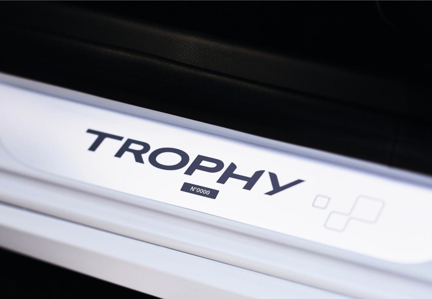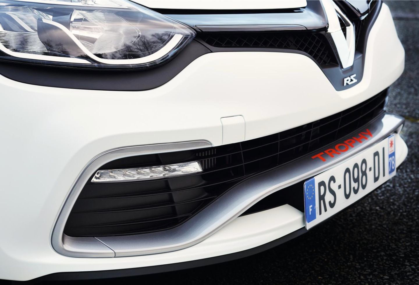 En el exterior los cambios no son muy estridentes. En el Clio RS Trophy se apuesta por la deportividad, pero manteniendo la discrección, si bien aquellos que busquen un look más agresivo podrán decorarlo con adhesivos. En las imágenes que sirve la marca destaca el color blanco (denominado «hielo nacarado», que contrasta con el techo negro, si bien habrá disponibles otras combinaciones entre ambos. Cuenta con unas llantas de aleación de 18 pulgadas negras específicas para esta versión. El conjunto lo completan diversos logotipos con el anagrama Trphy en el umbral de las puertas, boca de aire delantera y la moldura lateral.