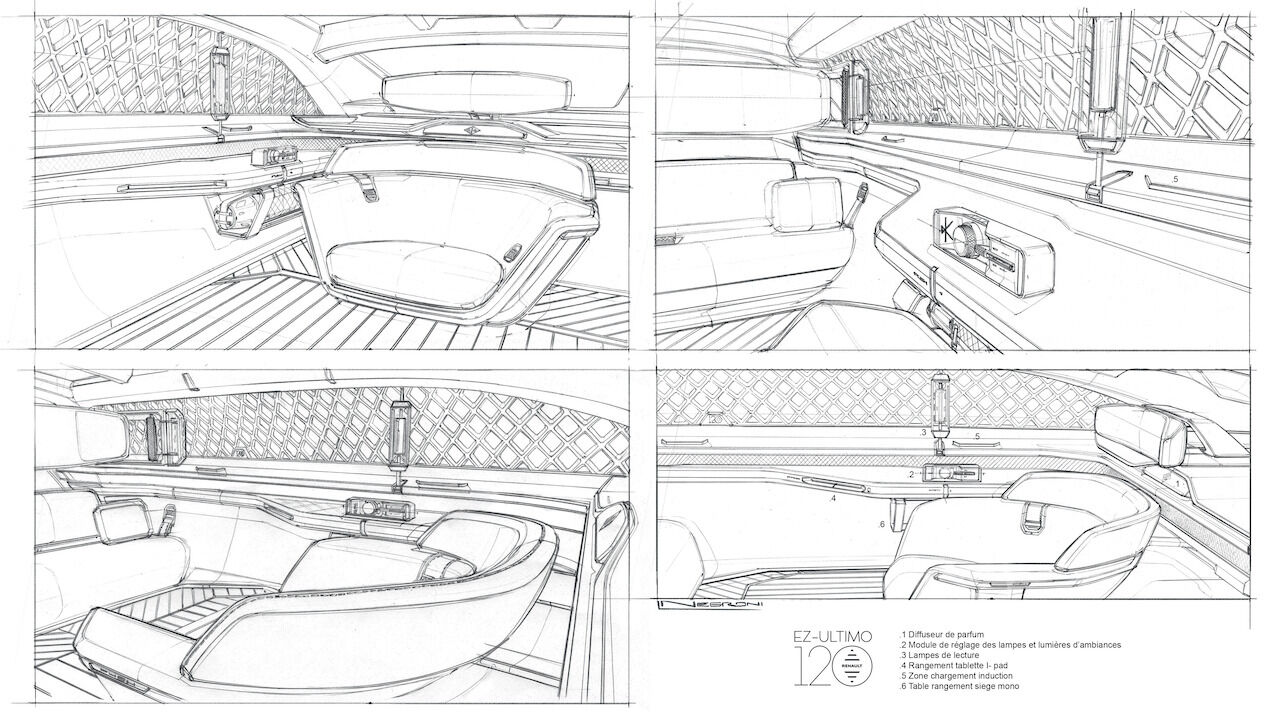 Los voladizos cortos, la gran distancia entre ejes y la ausencia de puesto de conducción hacen que hay un espacio muy aprovechable. Los materiales empleados son de primera calidad y destacan la madera del suelo, el cuero de los asientos o el mármol de algunas molduras. La tecnología viene de la mano del sistema multimedia Augmented Editorial Experience (AEX), que ofrece servicios de realidad aumentada. El Renault EZ-Ultimo es solo una visión de futuro, pero teniendo en cuenta como evoluciona la movilidad, no es una idea descabellada (aunque nos desagrade a los que amamos la conducción).