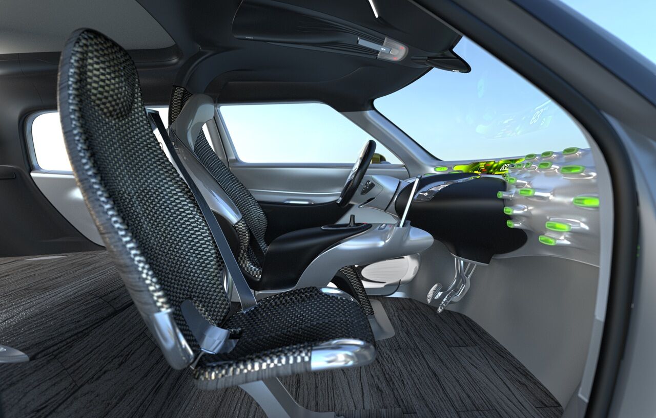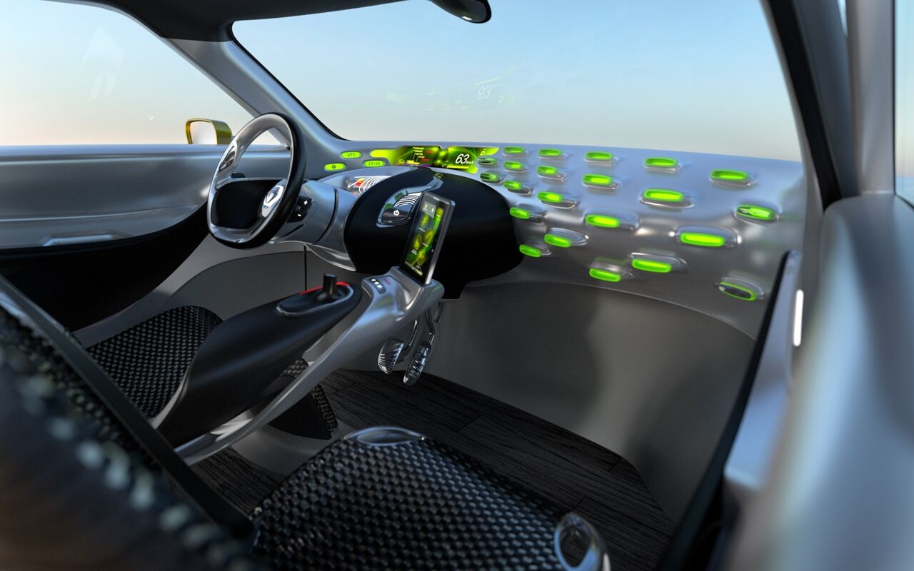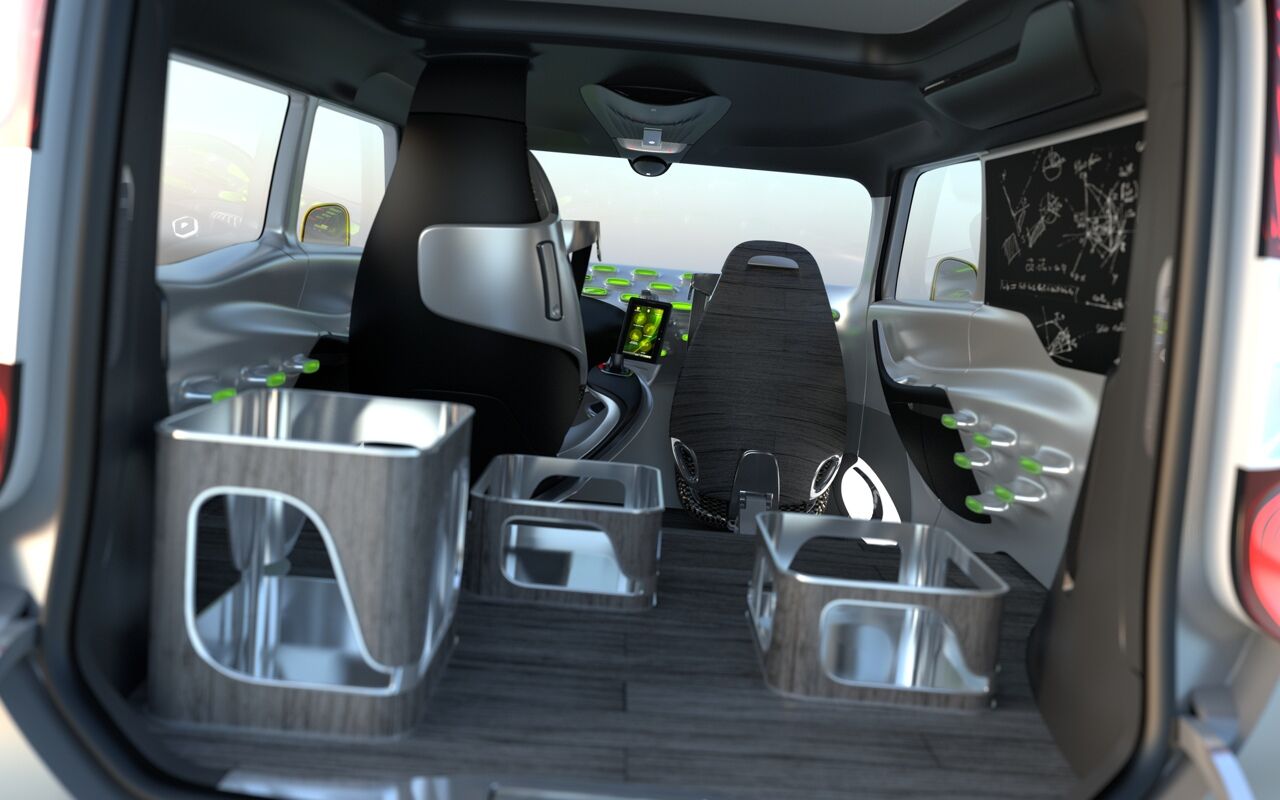 Por dentro, el lado del conductor, se han pensado como un banco de trabajo futurista, hecho de metal líquido. Unas luces verdes emergen del salpicadero para darle vida a esta arquitectura orgánica y lisa e informan sobre el modo trabajo. En modo familia, la atmósfera es más cálida: como un guiño al anterior concept-car R-Space dedicado a la familia, las luces verdes se tornan naranja.