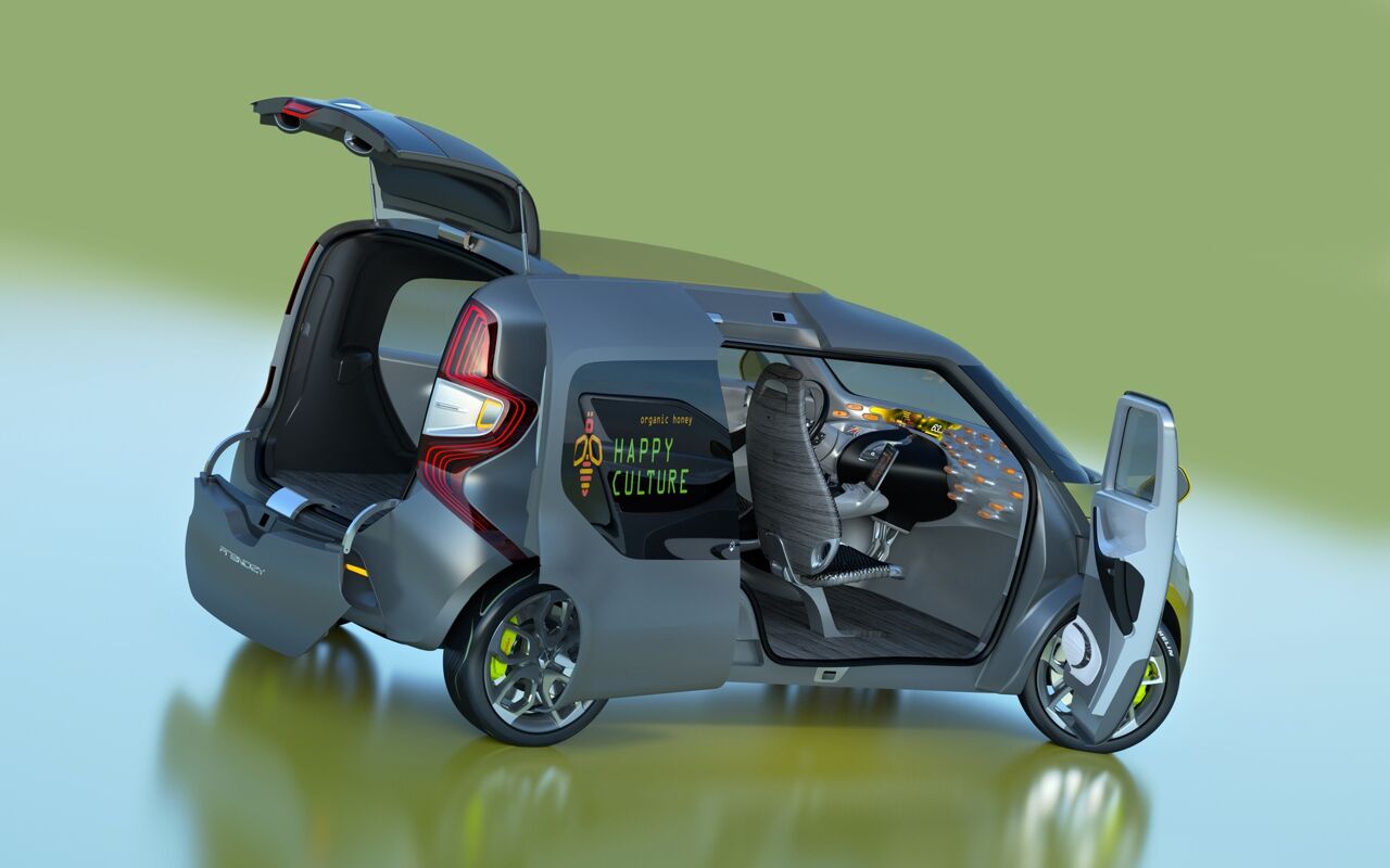 El Frendzy mide 4,09 m de longitud, 1,87 de anchura y 1,74 de altura. Es una auténtica oficina móvil, propulsado por motor eléctrico cero emisiones y que va equipado con la nueva tableta BlackBerry Playbook integrada, conjuga a la perfección los nuevos códigos estilísticos de Renault.