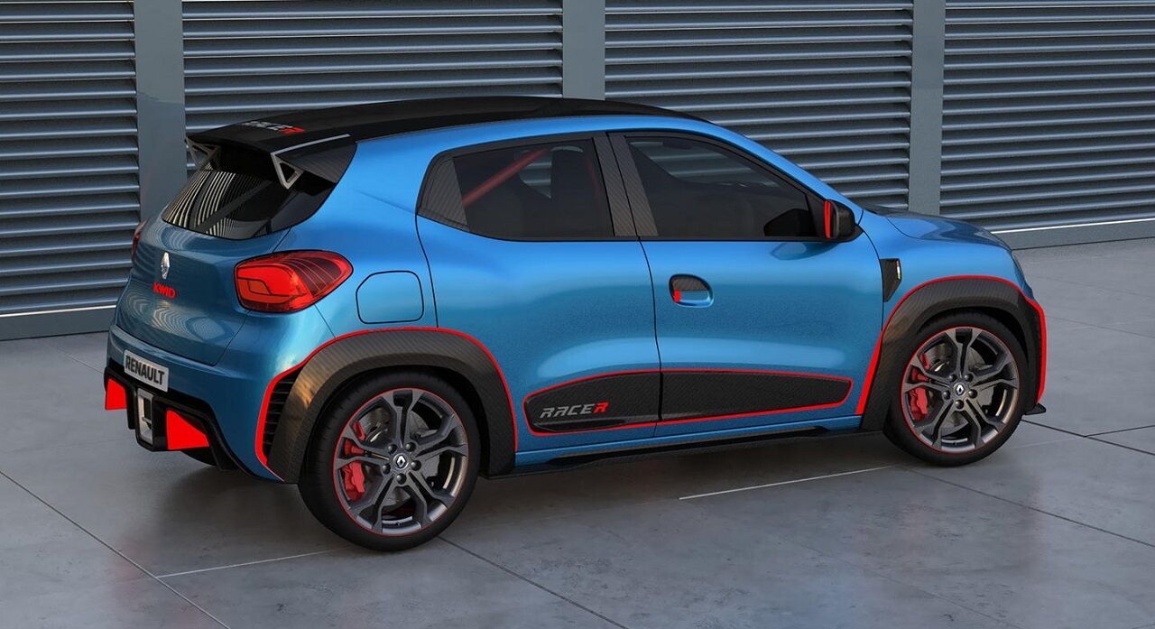 La versión más radical viene bajo la denominación Renault Kwid Racer. Se diferencia de las otras variantes por su carrocería más agresiva, las llantas de 18 pulgadas calzadas con neumáticos de perfil bajo y por su llamativo color azul metálico con detalles en rojo y el techo negro.