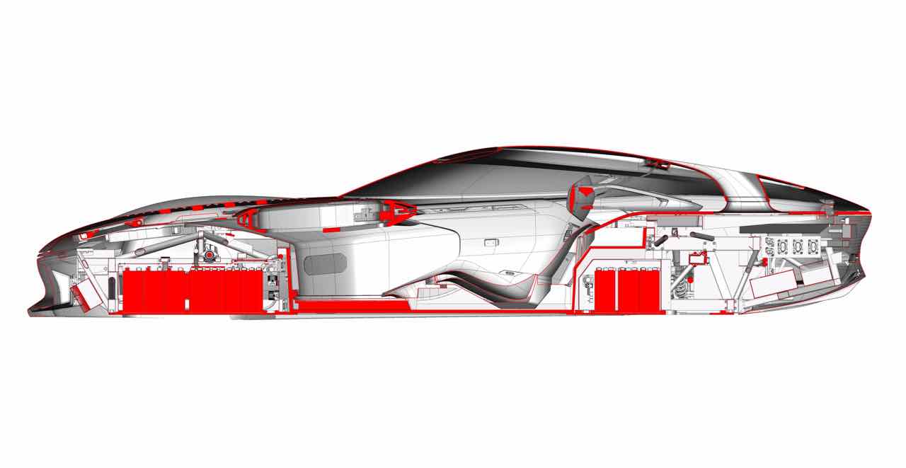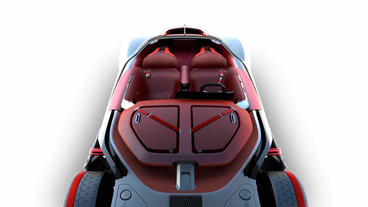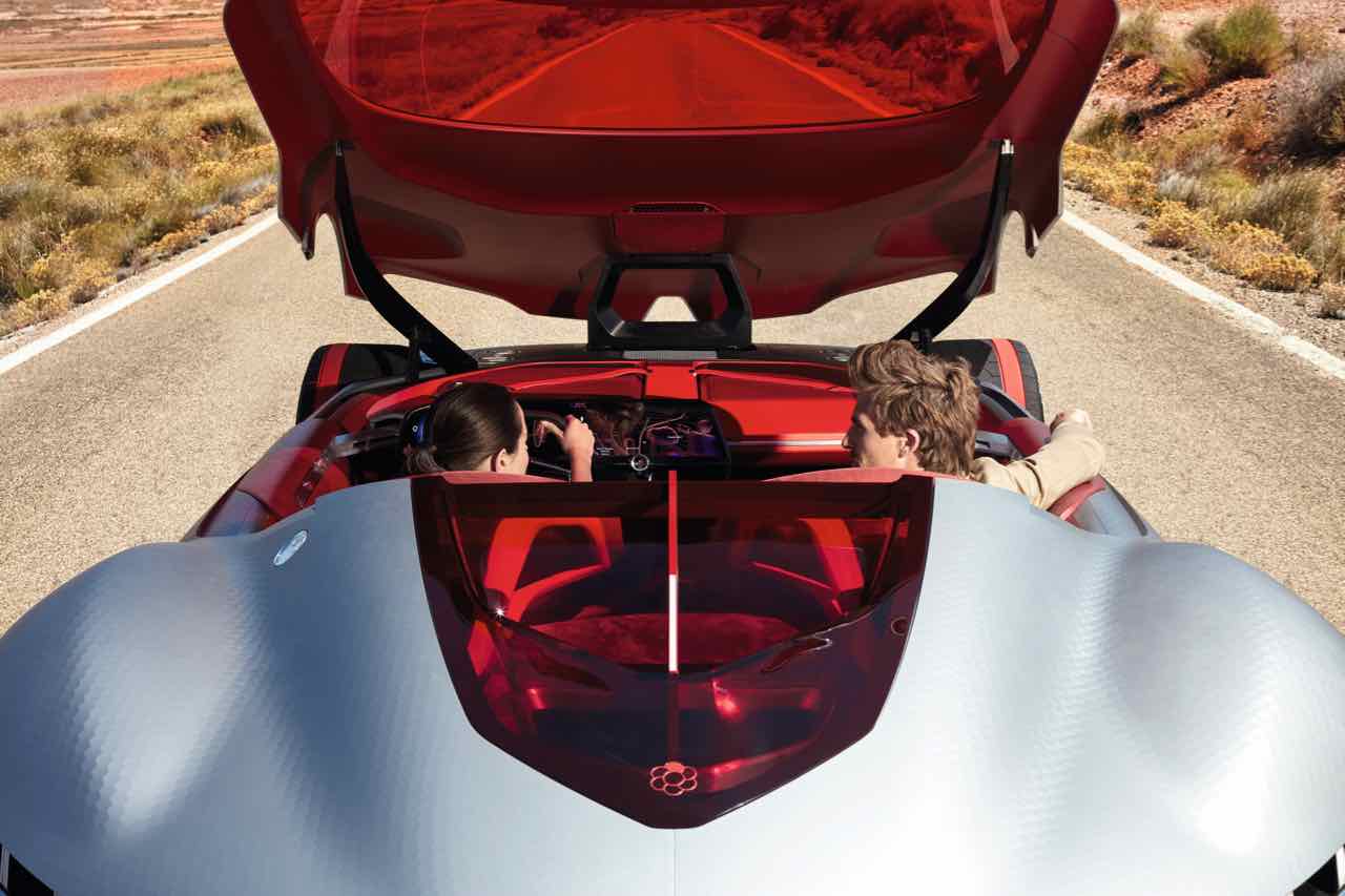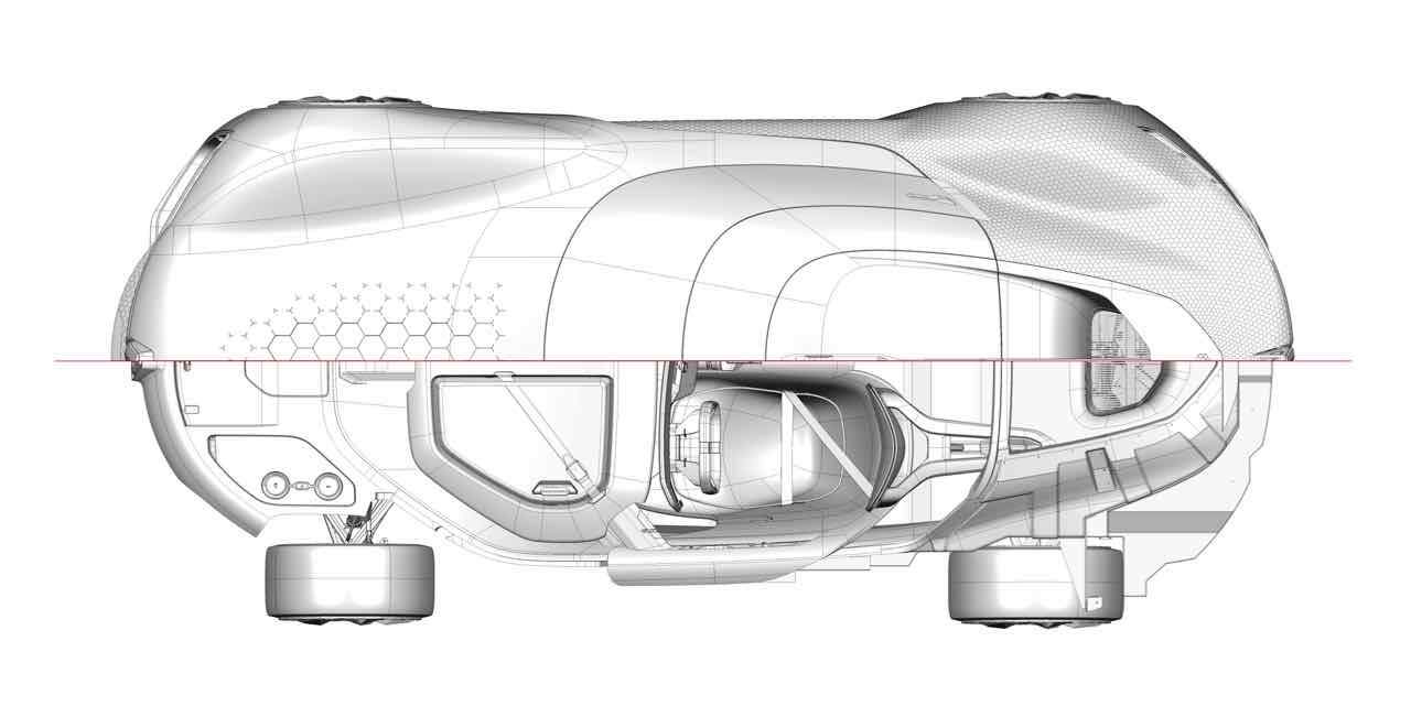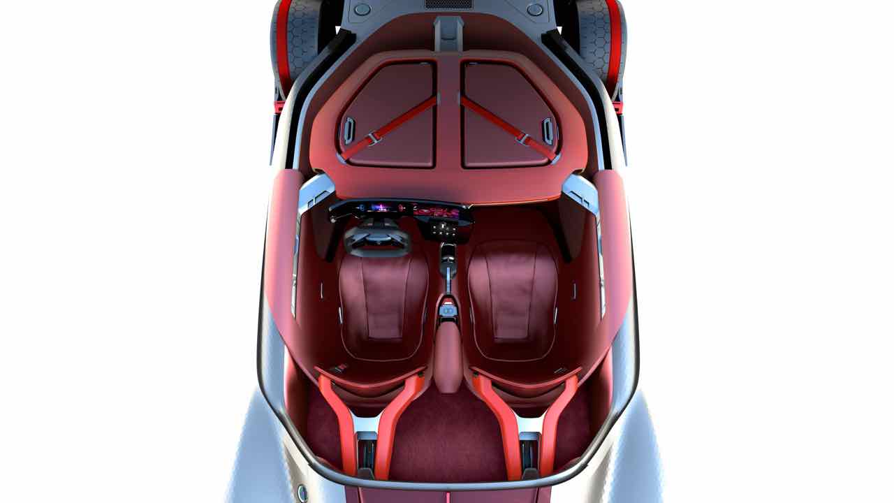 Abriendo la cubierta de una sola pieza se accede a un habitáculo futurista con un montón de espacio para dos personas, gracias a la generosa distancia entre ejes de 2,7 metros. Lo más destacado del interior es la gigante pantalla curvada OLED, realizada con Corning Gorilla Glass para ofrecer protección contra los arañazos.
