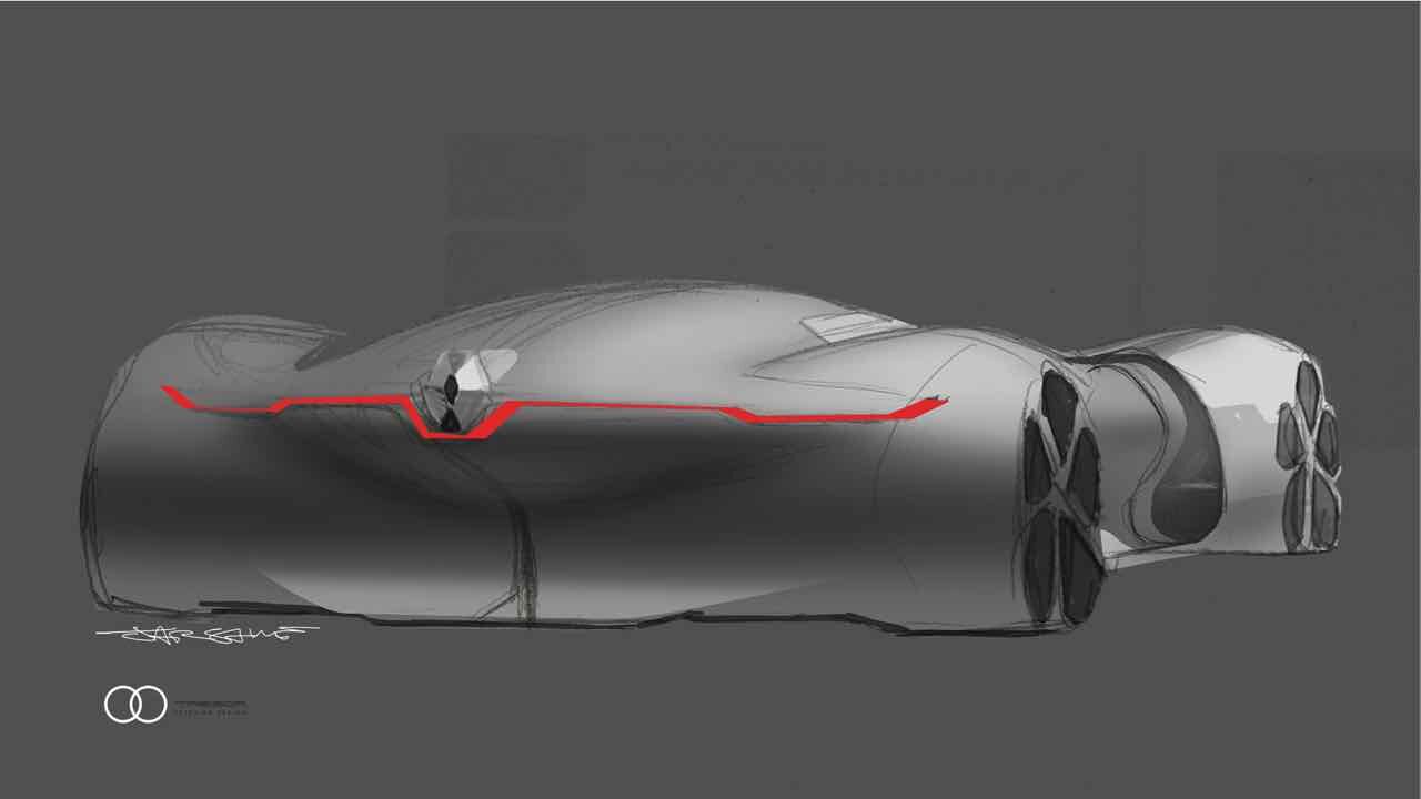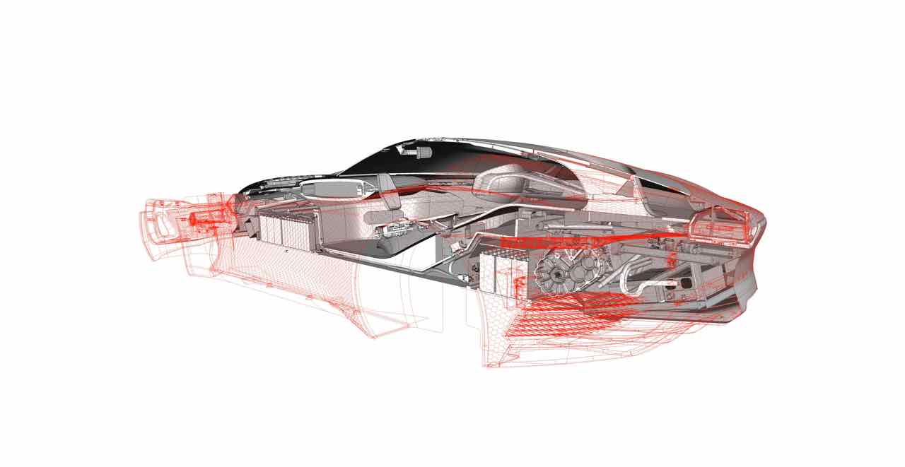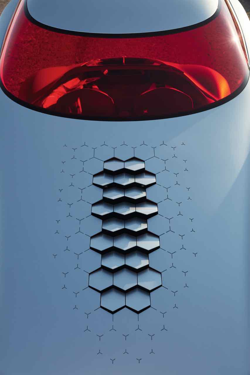 Con la forma de un gran turismo futurista de dos plazas, con un diseño elegante y curvilíneo de fibra de carbono, en el que destacan los cristales de color rojo que proporcionan un toque de contraste. Destacan paneles hexagonales y una trasera con una iluminación variable por fibra óptica. Mide 4.700 mm de longitud, por 2.180 mm de ancho y apenas 1.080 mm de altura. Gracia a ello es muy estable (el centro de gravedad se sitúa muy abajo) y tiene un coeficiente aerodinámico mu bajo, de apemas 0,22 Cx. Las llantas, de 21 pulgadas delante y 22 detrás, ponen el toque extravagante.
