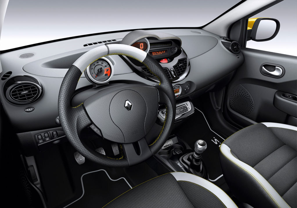 En cuanto al interior, vemos el equipamiento deportivo del Renault Twingo RS con volante en piel y asientos deportivos, pero se han añadido toques de amarillo como en el exterior.