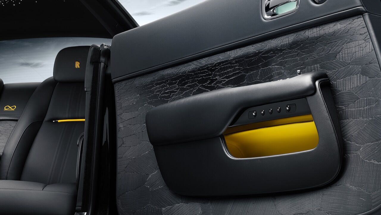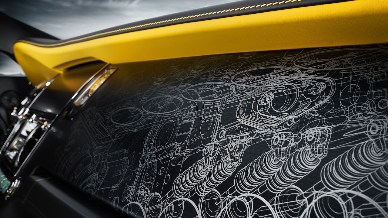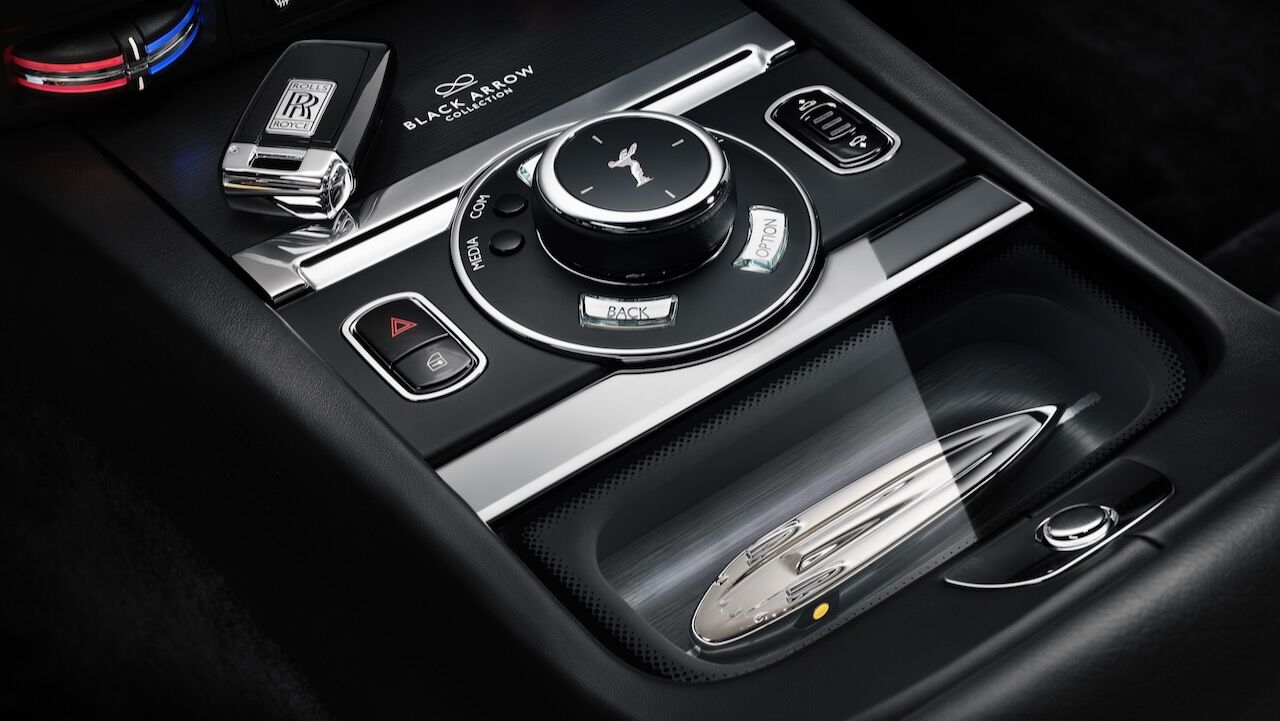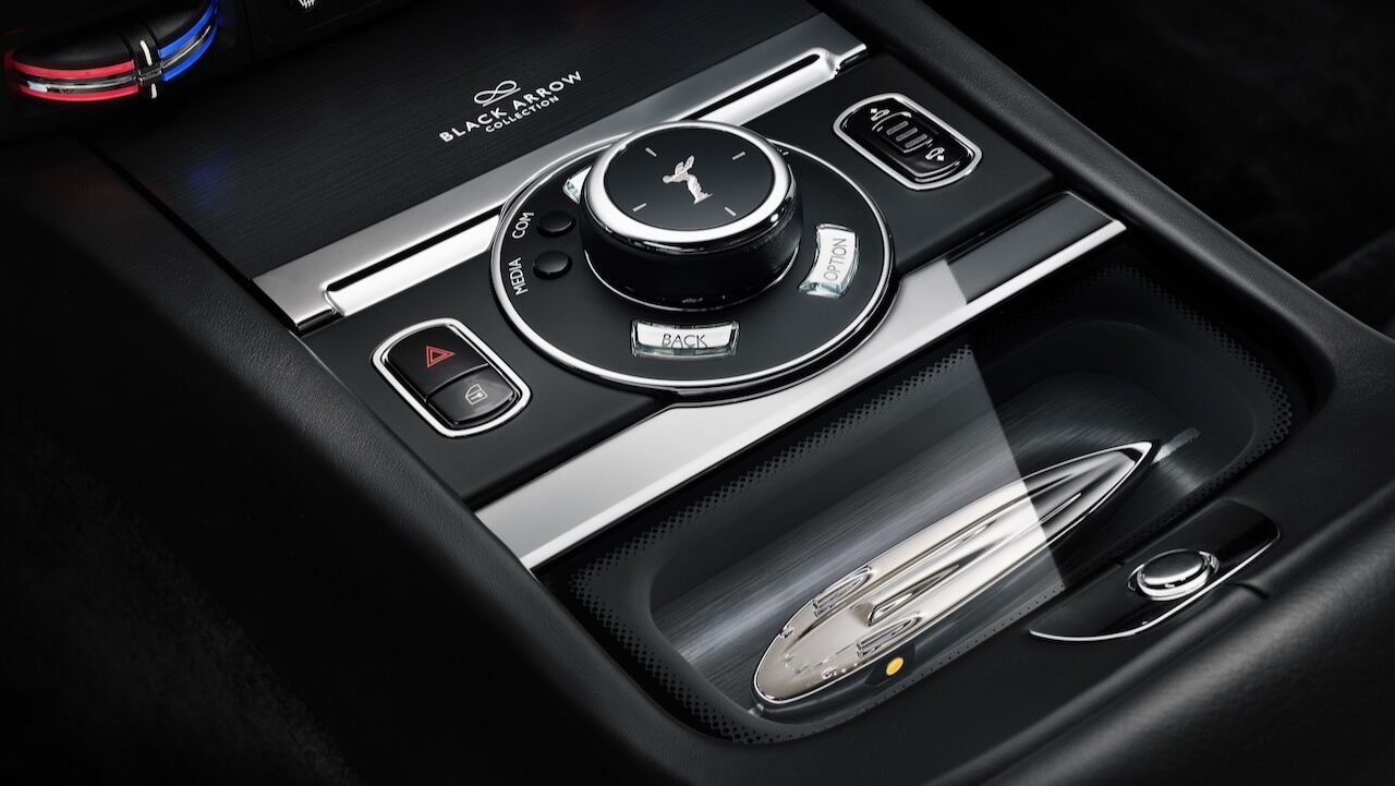 El interior del Rolls-Royce Black Badge Wraith Black Arrow no se queda atrás. El salpicadero es una obra de arte en sí misma, pues recibe un grabado sobre aluminio que representa la mecánica V12. Continúa con otros detalles como las puertas revestidas en madera Black Wood de poro abierto y sumando más de 320 piezas de marquetería multidireccional y láser para representar las Salinas de Bonneville donde se batieron los récords. La tapicería estrena el cuero Club, que destaca por su colorido y por el contraste que consigue con el resto de elementos.