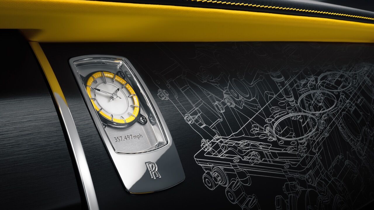 El «cielo estrellado» del techo de este ejemplar también es de récord, pues tiene nada menos que 2.117 puntos de fibra óptica iluminados que representan estrellas, el máximo número que hayan hecho nunca. No puede faltar un reloj de salpicadero que se inspira en los de los años 30 y que tiene las puntas negras y referencias al récord de velocidad. El Rolls-Royce Black Badge Wraith Black Arrow es una edición limitada a solamente 12 unidades que ya han sido asignadas a clientes.