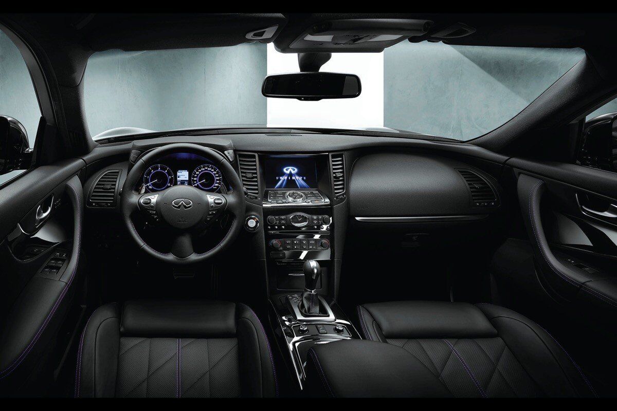 En el interior, el Infiniti QX70 S-Design destaca por el negro lacado de la consola central y las costuras en color púrpura de los asientos, el volante, los reposabrazos y los paneles de las puertas. Además, cuenta con el mismo equipamiento que el del acabado S-Premium del QX70, el más alto de su gama.