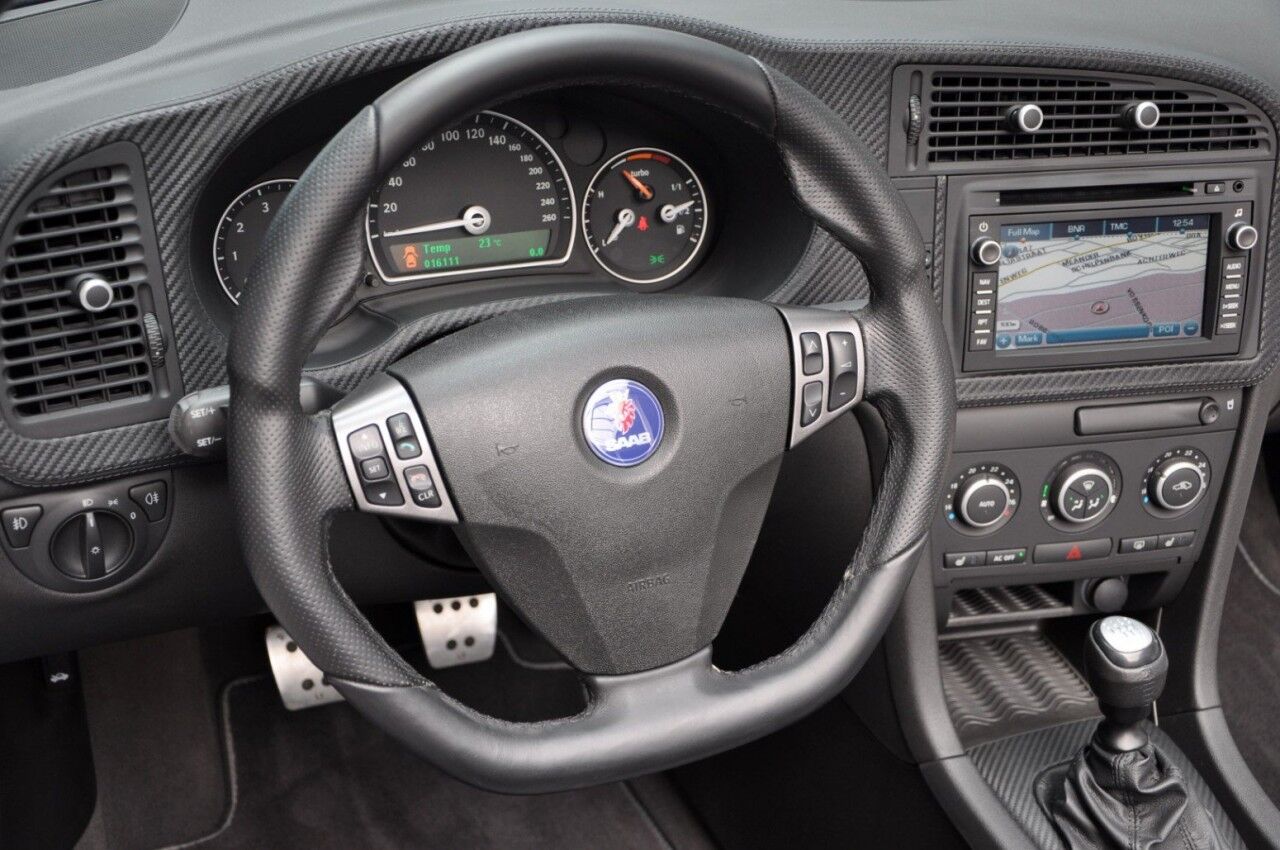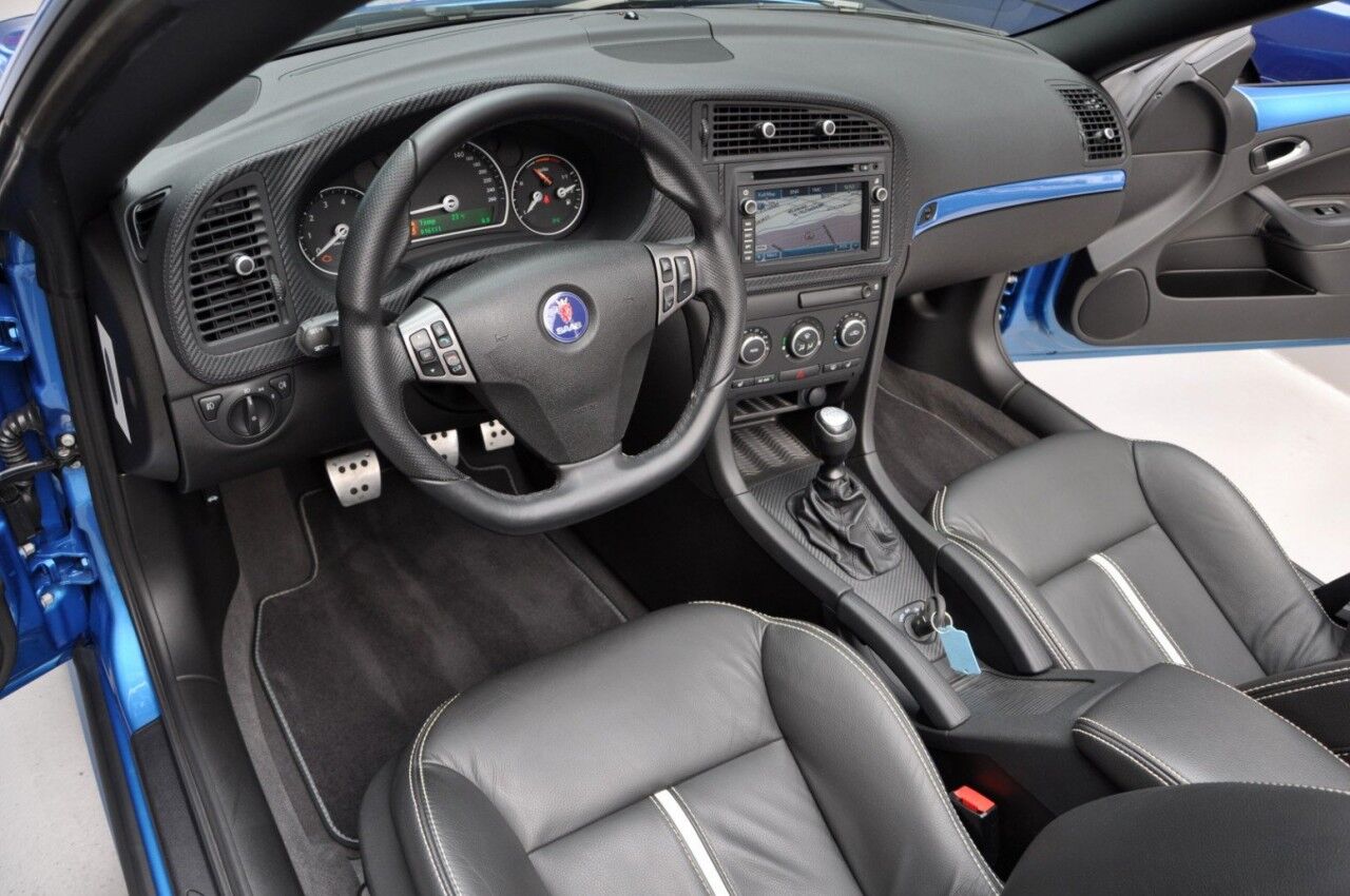 Sorprendentemente, el Saab 9-3 Cabriolet Aero Griffin Sky Blue Edition no se completó durante el proceso de quiebra de la empresa. Eso quiere decir que, cuando la línea de ensamblaje se detuvo el 9 de junio de 2011, el coche fue enviado al concesionario ANA Trollhattan AB, en Suecia, para ser terminado a mano. Así que ahí lo tienes: este 9-3 Cabriolet no es solo único y uno de los últimos creados, también está parcialmente terminado a mano.