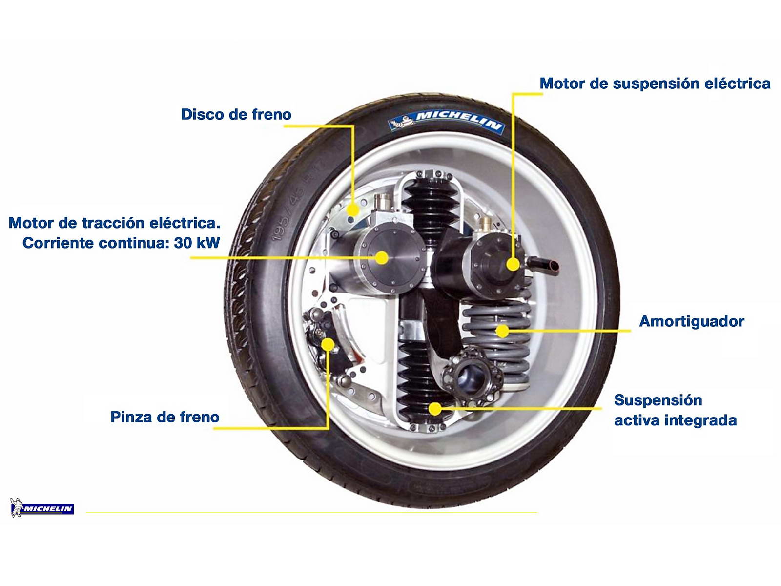Este sistema incorpora un motor en miniatura, un sistema de suspensión eléctrica y los frenos en la propia rueda. Al integrar ésta todos los componentes, se elimina la necesidad de llevar un motor bajo el capó, un sistema de suspensión tradicional, componentes de la transmisión y de la caja de cambios. Todo ello hace que los coches sean más ligeros y, por lo tanto, más eficientes en el consumo de energía. La rueda motorizada puede usarse en cualquiera de los ejes, tanto en el delantero como en el trasero.