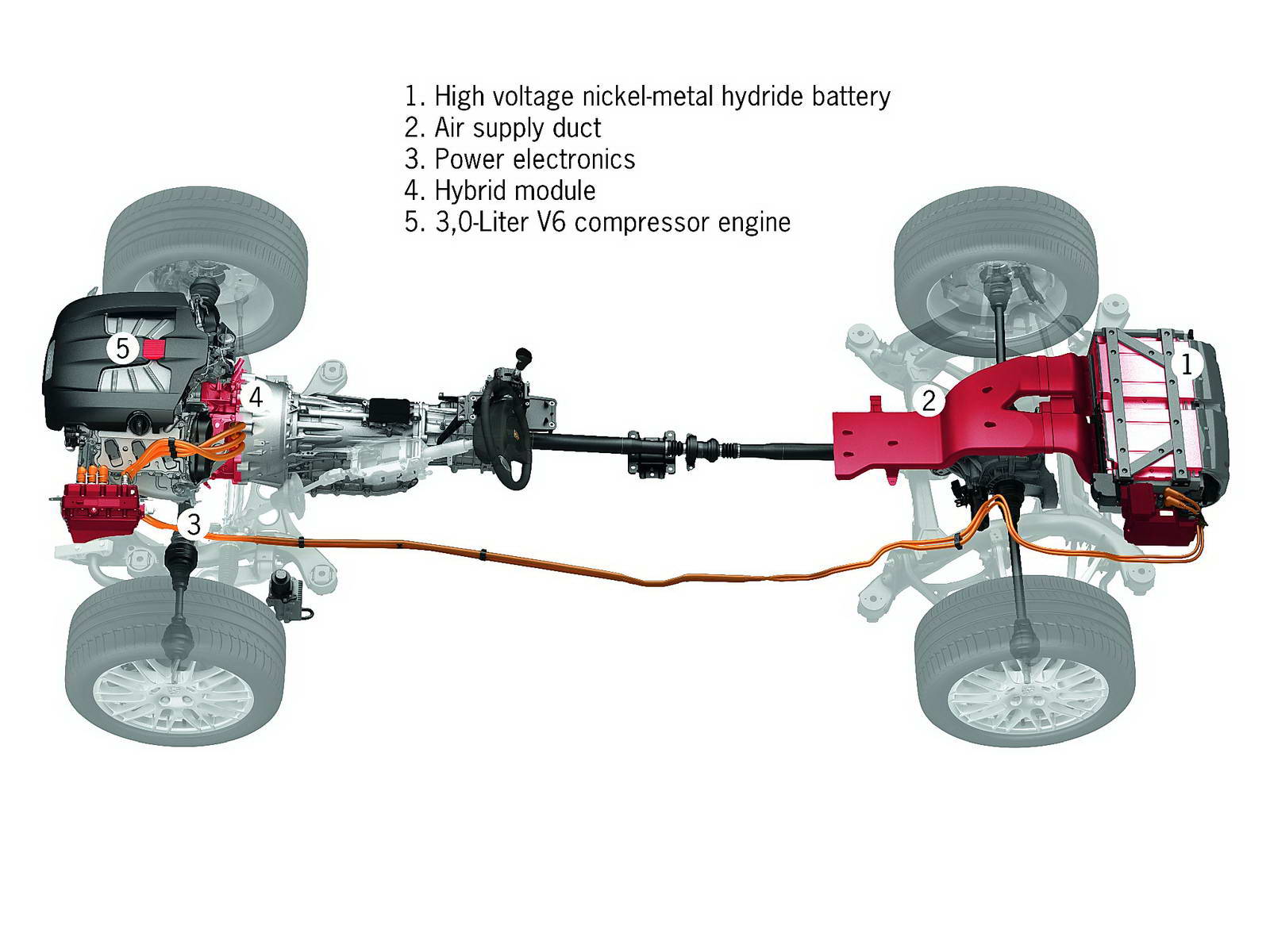 Con una arquitectura V6 y con tres litros de cilindrada, dispone de inyección directa de gasolina y 333 CV, unido a un motor eléctrico de 34 kW (47 CV). El par máximo llega hasta los 300 Nm, dispone de un cambio Tiptronic S de ocho velocidades y, por supuesto, de tracción total permanente. La aceleración de 0 a 100 km/h la lleva a cabo en 6,5 segundos, y la velocidad máxima es de 242 km/h. El consumo medio ponderado es de 8,2 l/100 km con unas emisiones de CO2 de apenas 193 g/km.