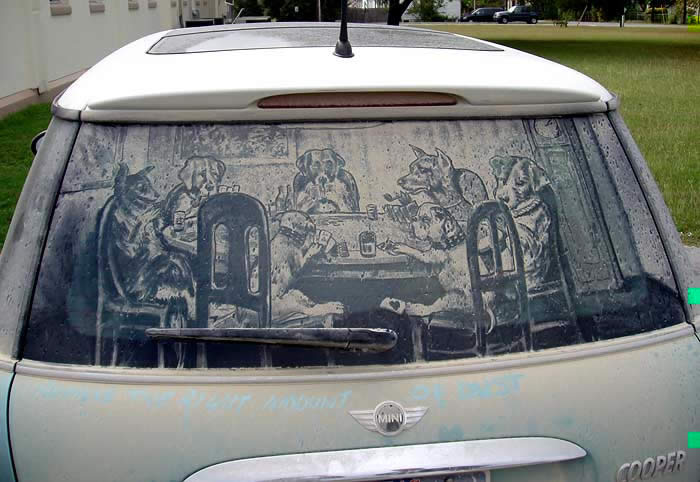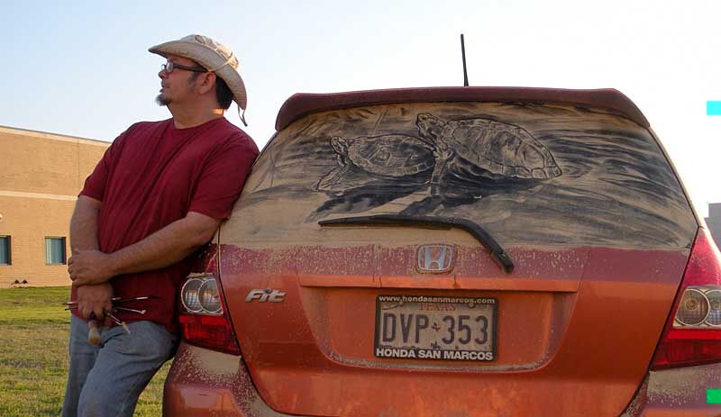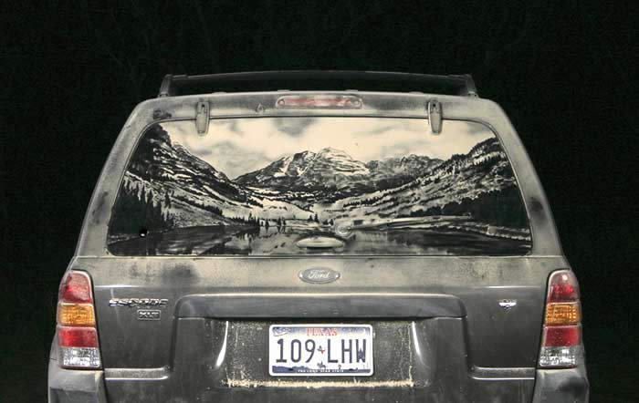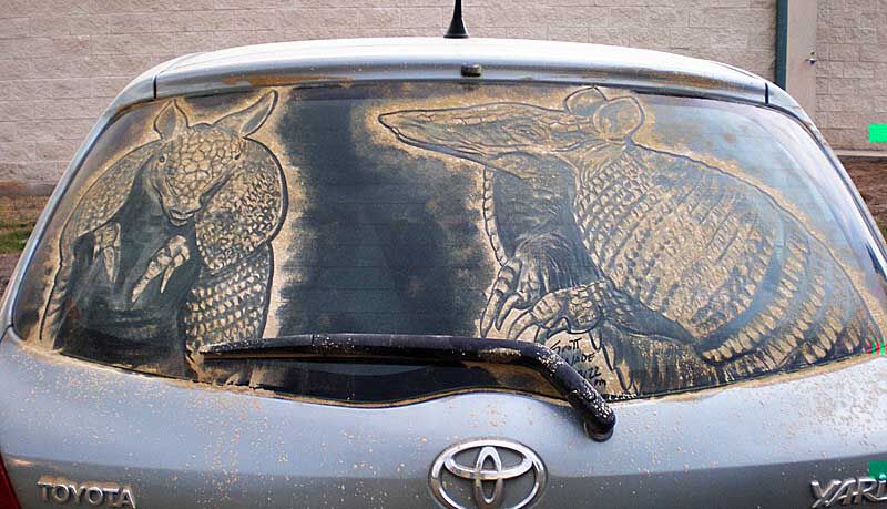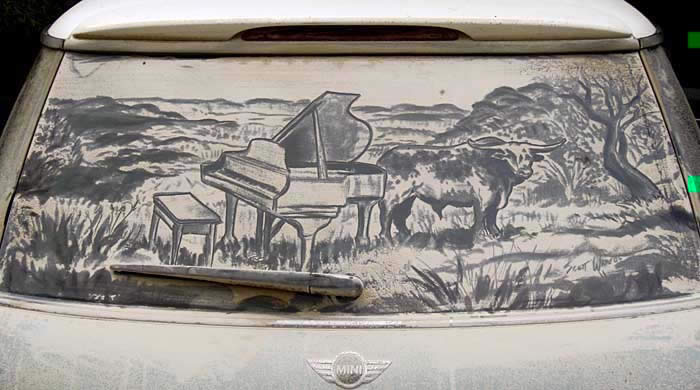 ¿Quién no ha visto alguna vez un coche con las lunas sucias y alguna fase escrita sobre el polvo acumulado? Pues el tejano Scott Wade ha convertido esto en arte. Allí donde muchos vemos una luna de un coche llena de polvo y suciedad, Wade ve un lienzo y pintura ya preparadas para comenzar su obra de arte.
