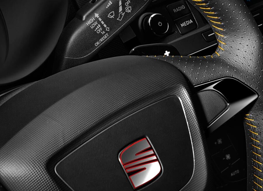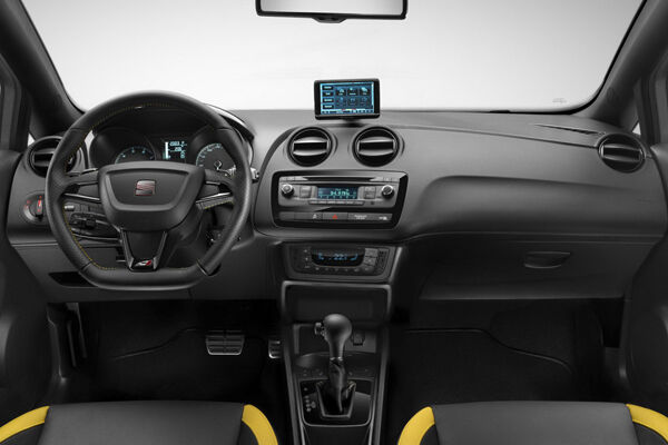 Ahora pasemos a su interior: habitáculo minimalista y bien estructurado. Las exigencias de Seat se demuestran por la calidad de los acabados y su precisa ejecución. El nuevo volante con el emblema Cupra -una de las novedades-, los instrumentos específicos y los asientos deportivos tapizados en piel con detalles laterales en color amarillo, a juego con el color exterior, son claros indicios de la importancia de la versión Cupra dentro de la gama del Ibiza. Y aquí te hablamos de una de una novedad importante: el novedoso Seat Portable System. Se trata de una pantalla portátil de cinco pulgadas, que se integra a la perfección con la electrónica del vehículo y el equipo de audio. Entre sus funciones destacan la de navegación, sistema manos libres Bluetooth y ordenador de abordo. Este nuevo sistema, según confirma Seat, estará disponible muy pronto como opción en toda la gama Ibiza.