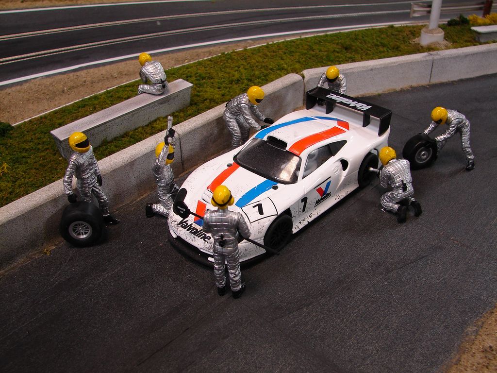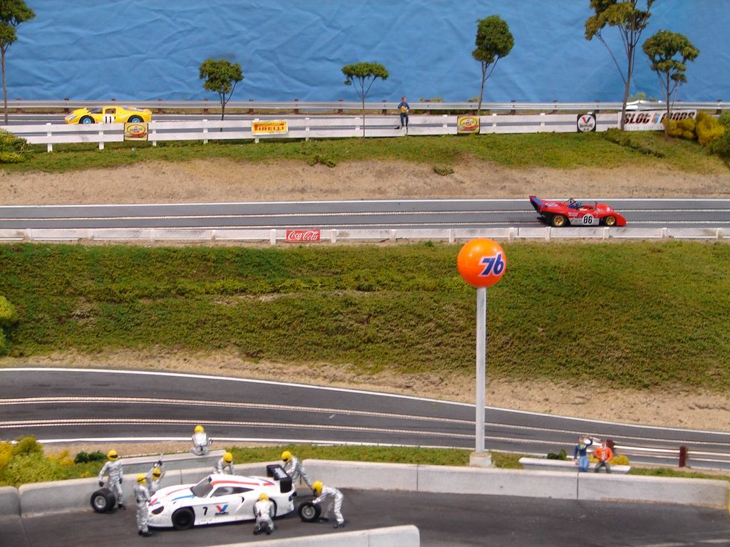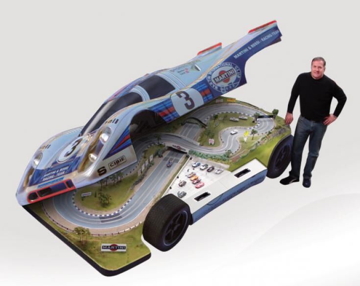 Se trata del Porsche RCR 917 que en 1971 Vic Elford y Gerald Larrousse condujeron a la victoria en las 12 horas de Sebring. Está realizado en fibra de vidrio y lo más complicado es buscarle un hueco en casa. Claro que siempre podrás bajarlo a tu plaza de garaje y darle envidia a tus vecinos. La pista que está dentro, a escala 1:32, es la misma de Sebring, por suspuesto. Con los coches en su ubicación original en la parrilla de salida, los anuncios del circuito situados en las mismas ubicaciones…