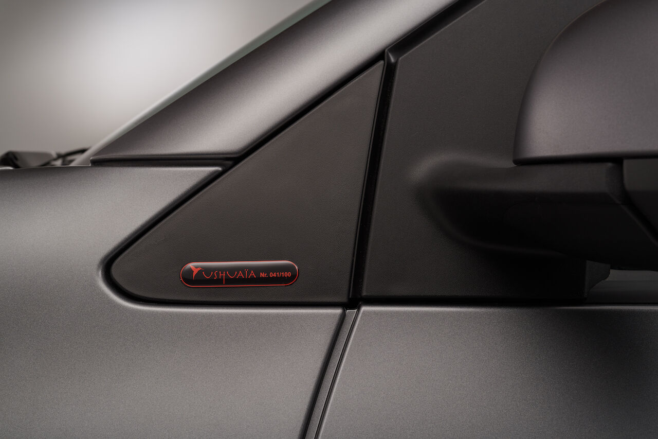 Se trata de un vehículo fácilmente reconocible y que se diferencia del resto de la gama por su completo equipamiento específico. En el exterior cuenta con el paquete style, que suma elementos como el splitter delantero, faldón lateral, difusor trasero y alerón en color rojo. Hacen contraste con los colores de carrocería disponibles, que son negro y gris mate. Las llantas son Brabus y también cuentan con un detalle en rojo y el logo del hotel/discoteca en el centro. Ese distintivo de Ushuaïa también aparece en los retrovisores.