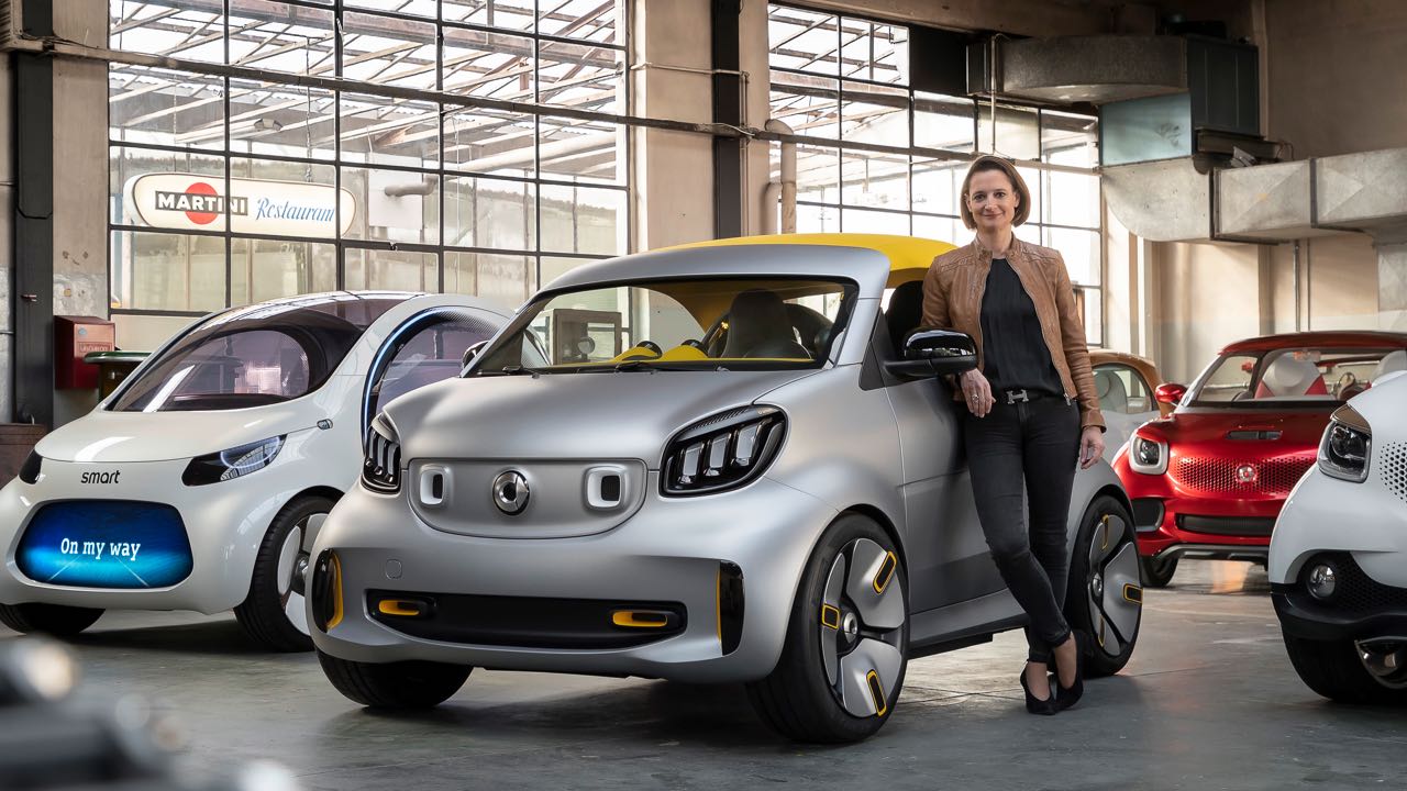 Head of smart Katrin Adt, with the smart showcars (f.l.t.r.): vision EQ fortwo, forease+, forvision, forstars und fourjoy.
