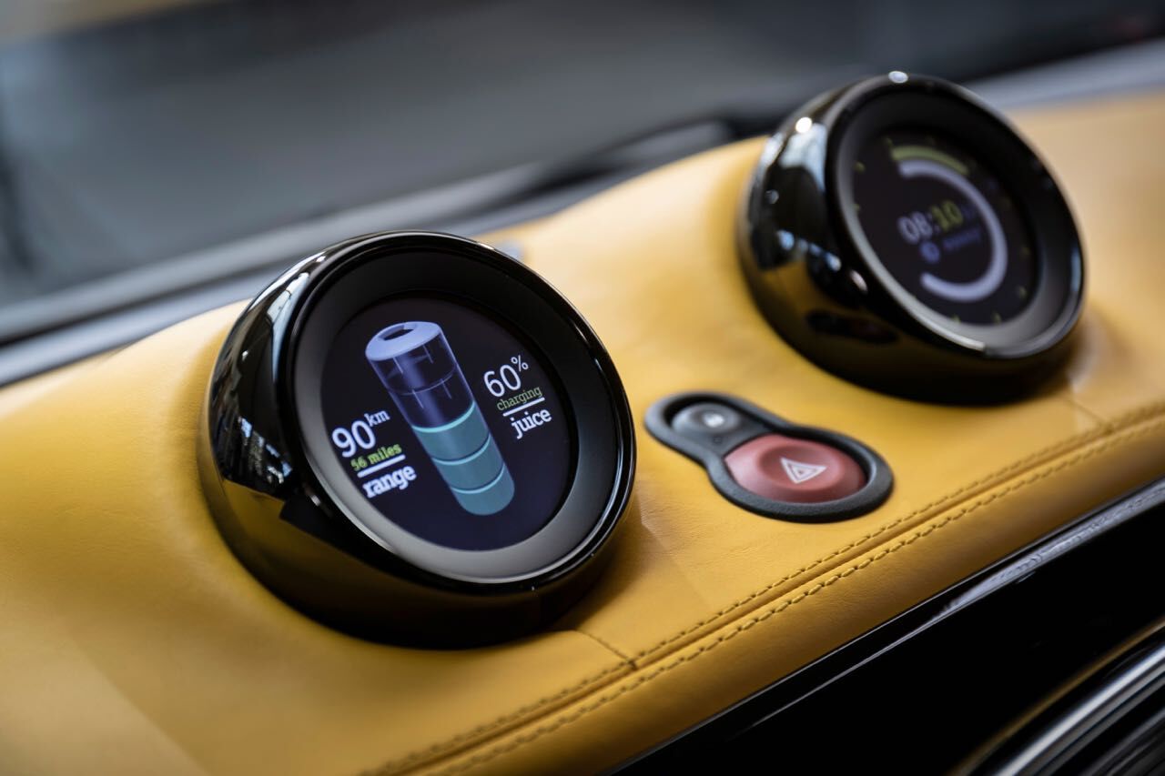 Llamativas también las llantas, que persiguen maximizar la eficiencia aerodinámica y que casan muy bien con el color mate de la carrocería... y el naranja que se usa en el techo... y en el interior, de cuero de napa, el mismo material (pero en negro) con el que se han revestido los asientos o los paneles centrales de las puertas. El volante no será cómodo al ser usado, pero es desde luego muy pintón, sobre todo cuando sabes que está revestido con microfibra color antracita.