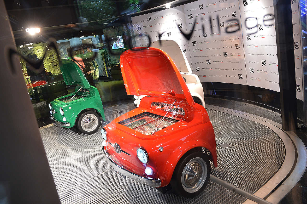 El fabricante italiano Fiat se ha involucrado en el lanzamiento de una nueva versión del Fiat 500... con menos de 0,1 CV de potencia. Se trata de un frigorífico con la forma exacta del frontal del microurbano, creado en colaboración con la firma Smeg, epsecializada en crear neveras especiales y con la que la marca automovilística italiana ya había colaborado en la producción de frigoríficos en los años 50.