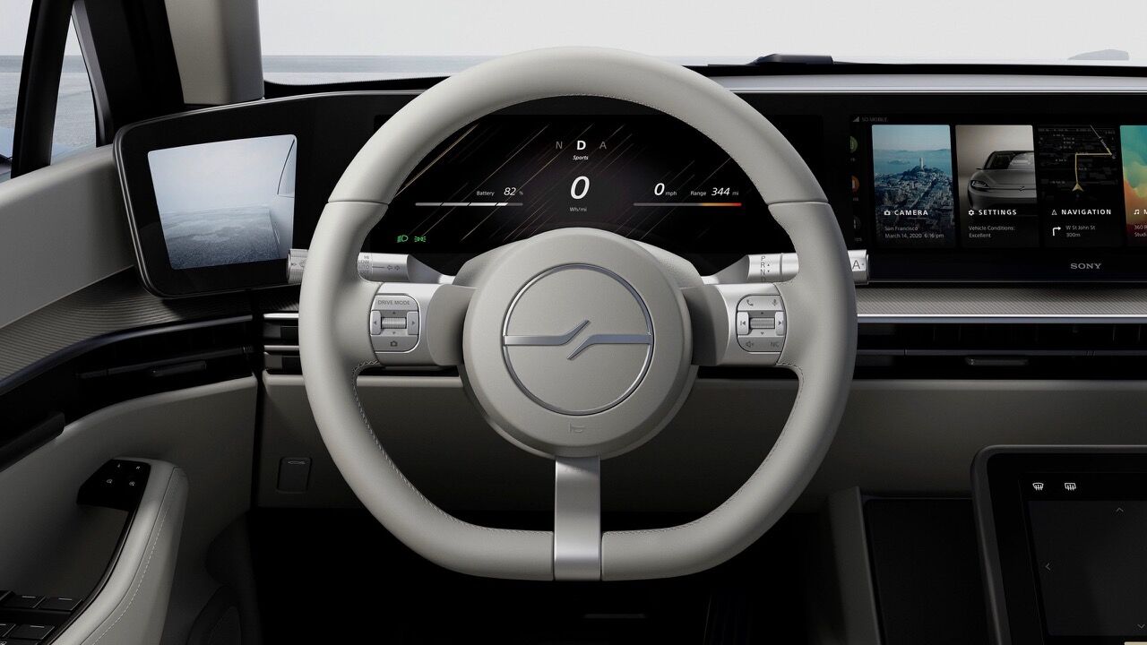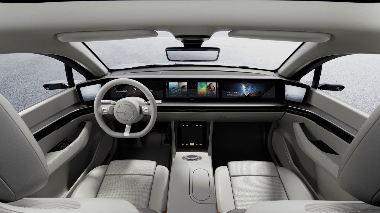 Aunque en el apartado donde quiere destacar este prototipo es en el tecnológico. Se beneficia de toda la experiencia de Sony en el campo y lo podemos ver en su interior. Es minimalista, sin botones, con una enorme pantalla que ocupa toda la anchura del salpicadero. No se dicen las pulgadas, pero podría estar a la altura de la de 49 pulgadas de Byton. A ambos lados hay otro par de pantallas para reflejar las imágenes captadas por las cámaras que sustituyen a los retrovisores tradicionales.