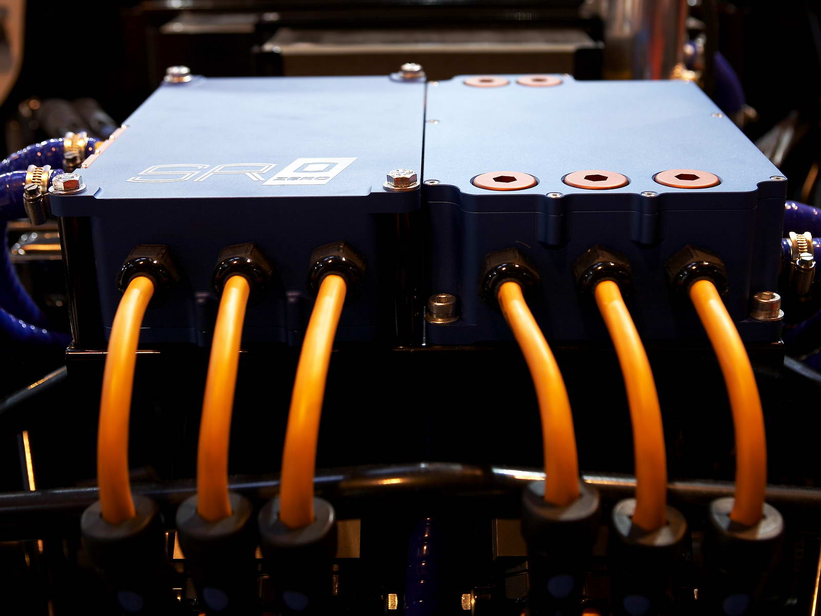 Los dos inversores utilizados transforman la corriente continua de las baterías en corriente alterna, necesaria para accionar los motores eléctricos. También permiten recuperar la energía cinética generada cuando el vehículo frena y almacenarla después en las baterías.