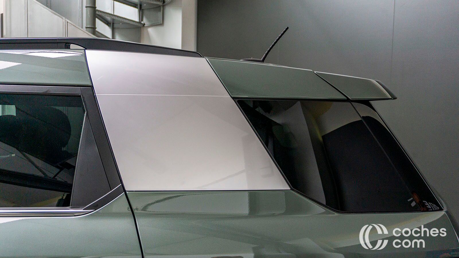 En los cuadrados pasos de rueda quedan ubicadas unas llantas que pueden ir desde las 17 hasta las 20 pulgadas. Hay barras de techo y los retrovisores tienen unas formas cuadradas muy de todoterreno. Por no hablar de ese pilar C que va en contraste y que nos recuerda ligeramente al del Defender o de esa zaga tan especial. La trasera tiene un portón en el que se simula la forma de la rueda de repuesto en esa zona, una referencia al pasado. También el tirador está en el lateral, aunque la puerta abra de forma convencional.