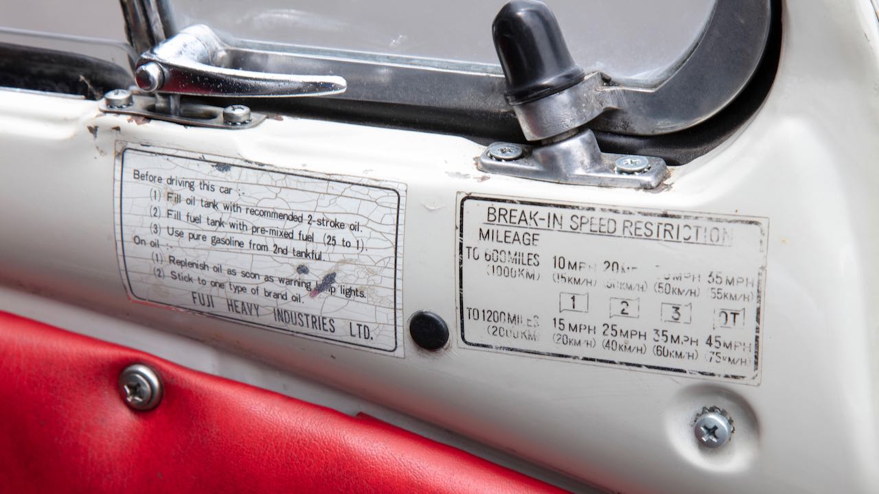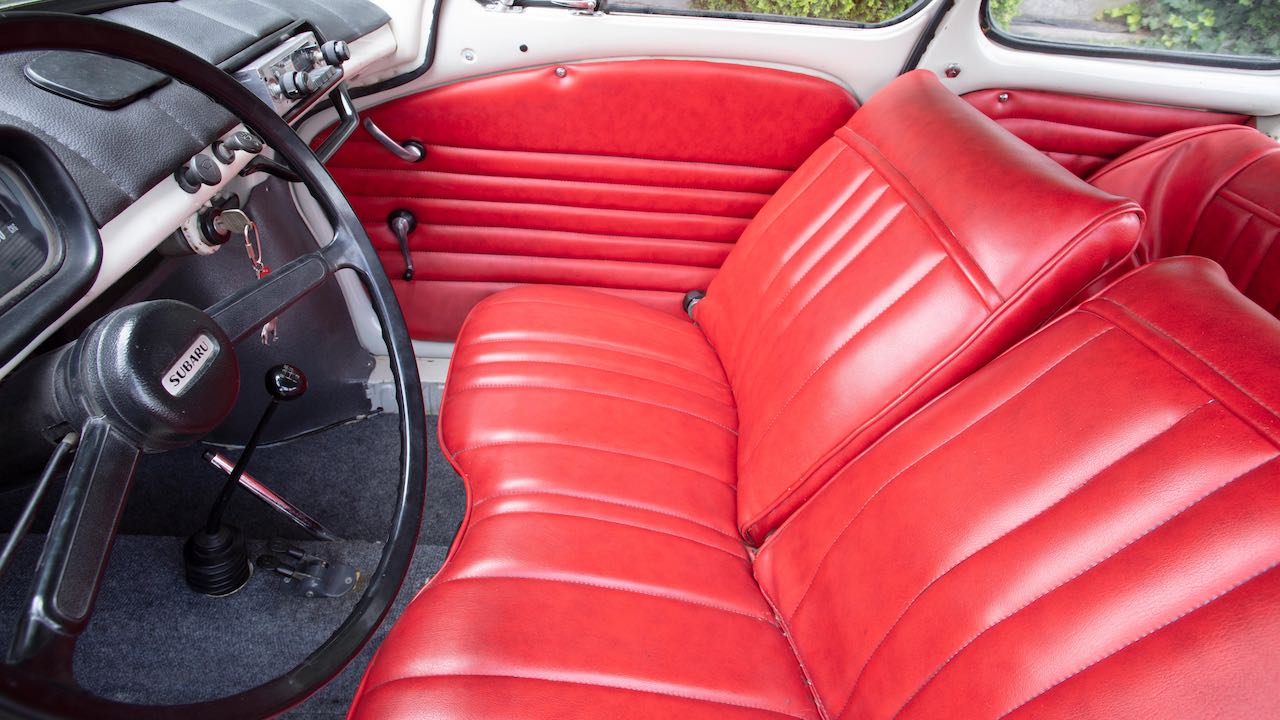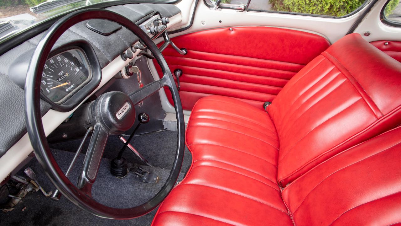 Y si hoy nos hemos acordado del Subaru 360 es porque el día 13 de agosto se subasta la unidad cuyas imágenes acompañan a este artículo. Se trata de un Subaru 360 Deluxe, propulsado el motor de dos tiempos y dos cilindros de 356 cc con 36,5 CV, asociado a una transmisión manual de 3 velocidades. Era la versión más equipada, con cromados en ruedas y otras zonas para que entrase por los ojos a los compradores estadounidenses.