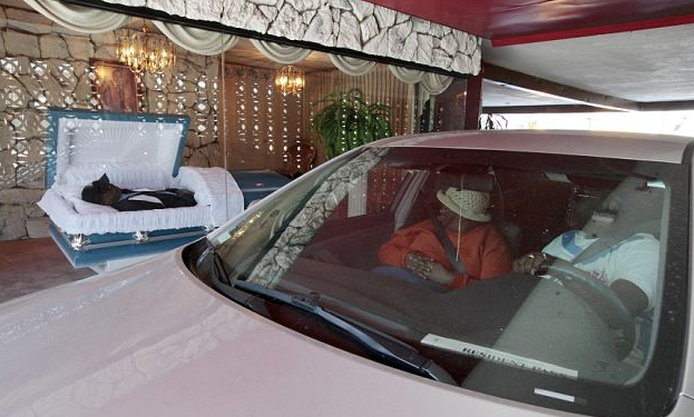 Al estilo de los restaurantes de comida rápida, que sirven directamente a los conductores, el fallecido es colocado en un habitáculo tras un cristal antibalas, con una decoración elegida por los familiares. La entrada está protegida por una valla que se levanta cuando un dispositivo electrónico reconoce las matrículas de los autorizados al velatorio.