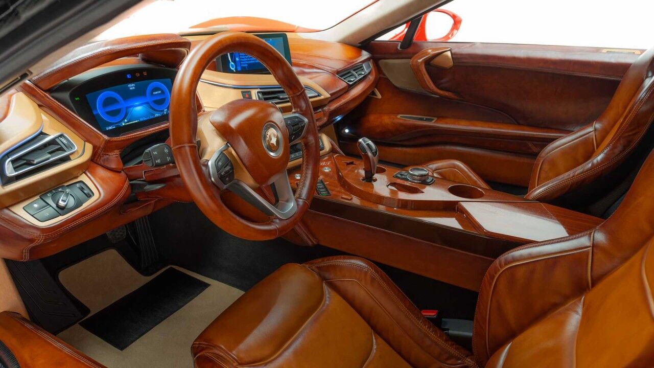 Con 4.980 milímetros de longitud, también es 300 mm más largo que el modelo del que toma la base, gracias en gran medida al incremento del voladizo trasero. Pero es en el interior donde los genes germanos se pueden percibir con más claridad. Toando la arquitectura del i8, el habitáculo del Taraschi presenta una gran cantidad de cuero en color marrón y crema, así como molduras de madera por doquier. La consola central se parece más a un mueble clásico que a un elemento interior funcional del coche, aunque mantiene los mismos botones y selector del cambio de BMW.